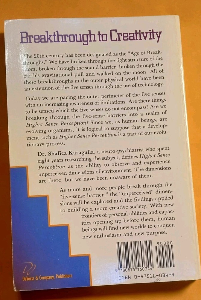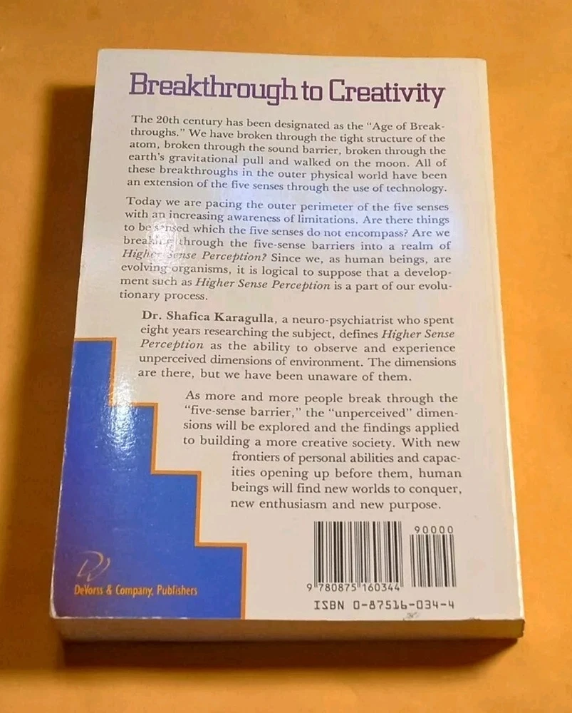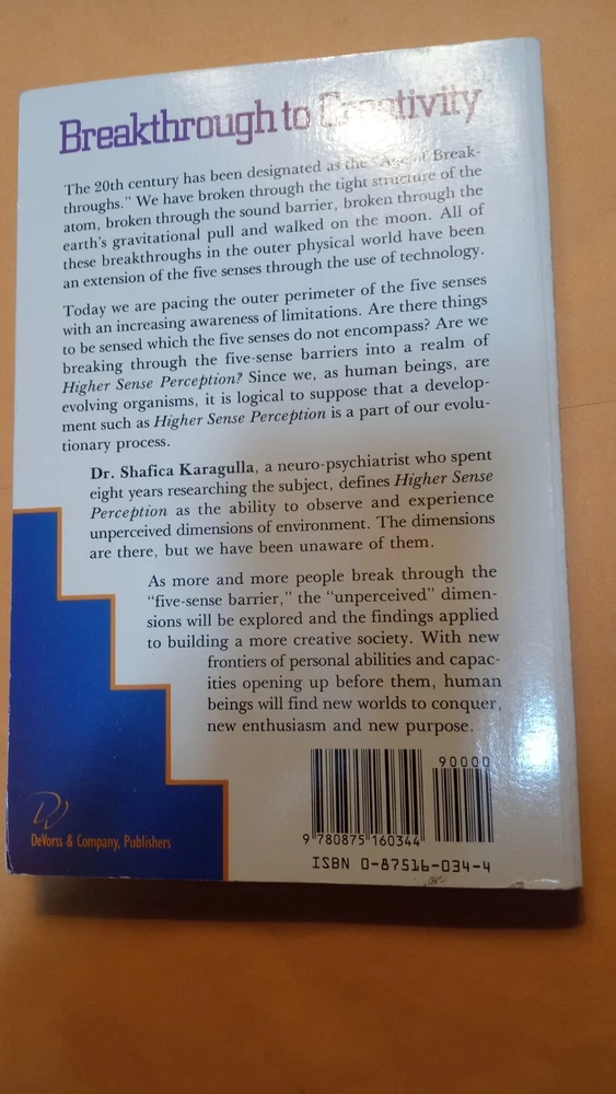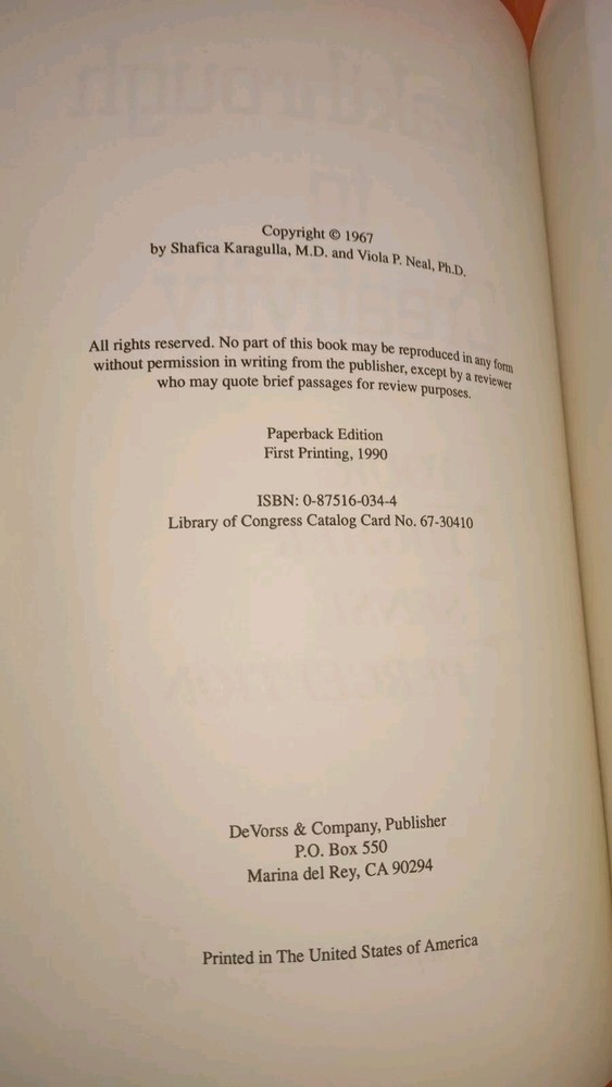 This book is a rare gem for those interested in parapsychology and metaphysics. Written by Shafica Karagulla, MD, it explores the subject of higher sense perception and creativity. This is the first paperback edition and was printed in 1990 and is an original copy. The book is inscribed with ," To Dick & Dixie with love Zo" on the first blank page of the book and has 268 pages. It weighs 14.4 ounces and is a 1st Paperback Edition. The language is English and it was published by Devorss & Company in Marina del Rey, CA. This book is a must-have for anyone interested in expanding their consciousness and exploring the world of parapsychology. Aside from the inscription there is No other writing or highlights in the book. The pages are crisp , clean and bright white. There is no creases or bent corners and all 268 pages are present. The spine is strong secure. The book cover is creased on the front top corner. The corners have some wear. The edges of the pages have a few smudges and some wear. The binding is good with no creases. Overall this book is in very good condition. I'm selling this book As Is Please be sure to look at ALL the pics posted. They are of the exact book you will receive. If you have any questions or would like to see more photos. You can message me they eBay messages and I will respond quickly. I have packed this book with care and it's ready to be shipped out. I will ship via USPS Media Mail. You will also have the option to ship Priority Mail Flat rate padded envelope . Just be sure and select that option before you pay. Please take a moment and check out the other books and cool items I have for sale I want to thank you for your time and consideration.