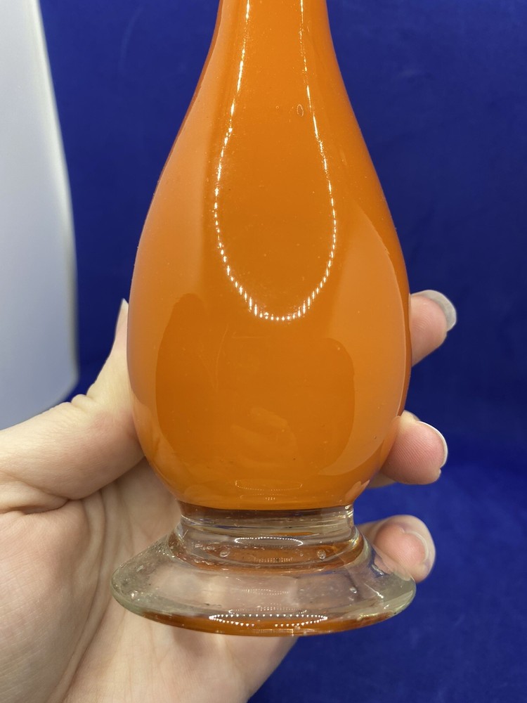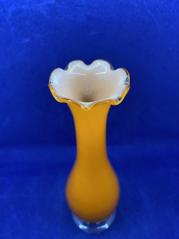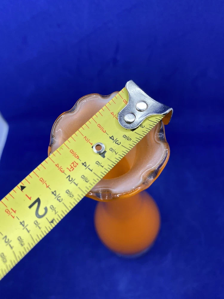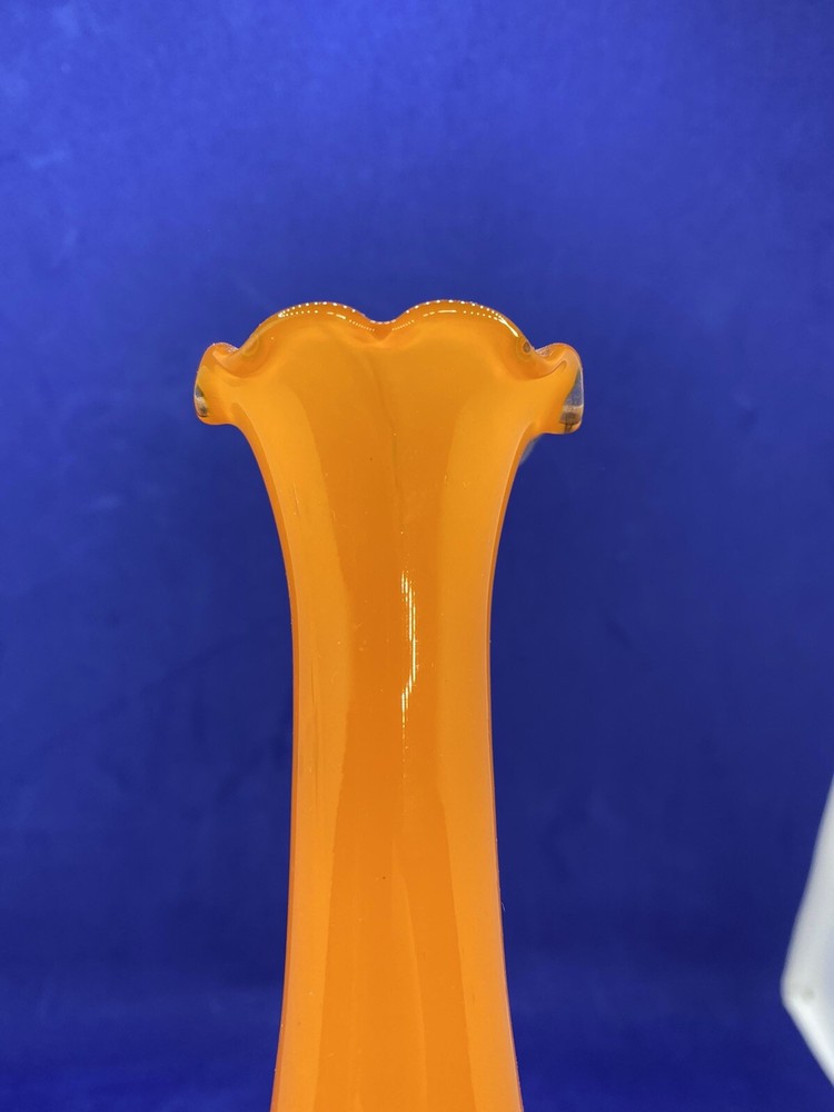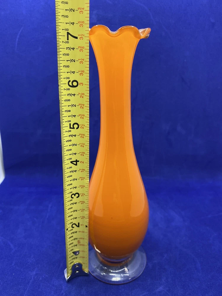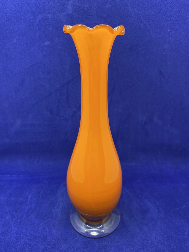 MAKE AN OFFER!! NO chips, cracks or any other damage to the piece. Some bubbles and impurities trapped in the Pedistal base but I think it gives this piece a unique character. Please see all pictures for details and measurements and ask questions before buying. Ask about combined shipping on other items in my eBay store and enjoy!! Bright Orange Mid Century Scalloped Hand Blown Glass Vase On Pedistal. Condition is "Used". Shipped with USPS Priority Mail.