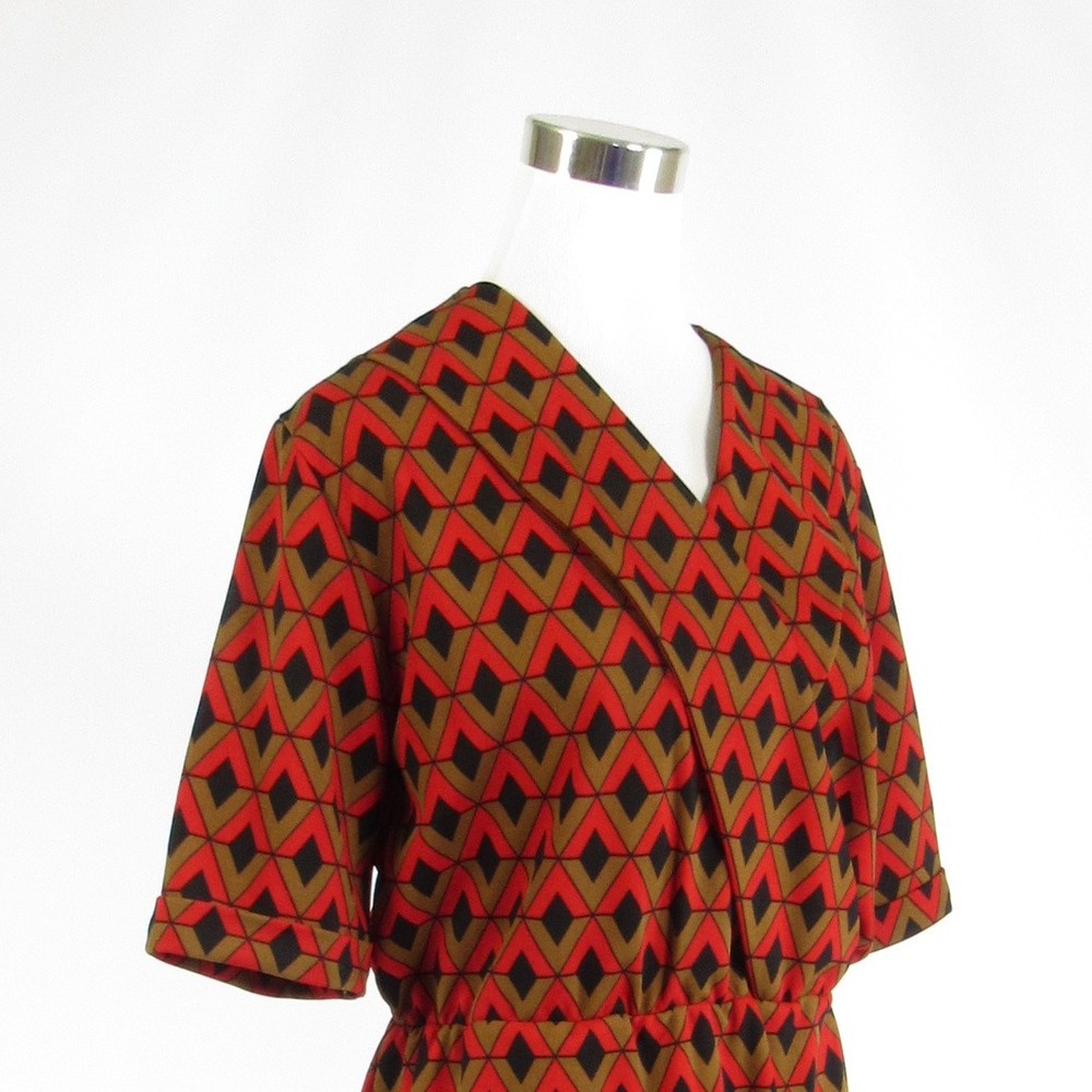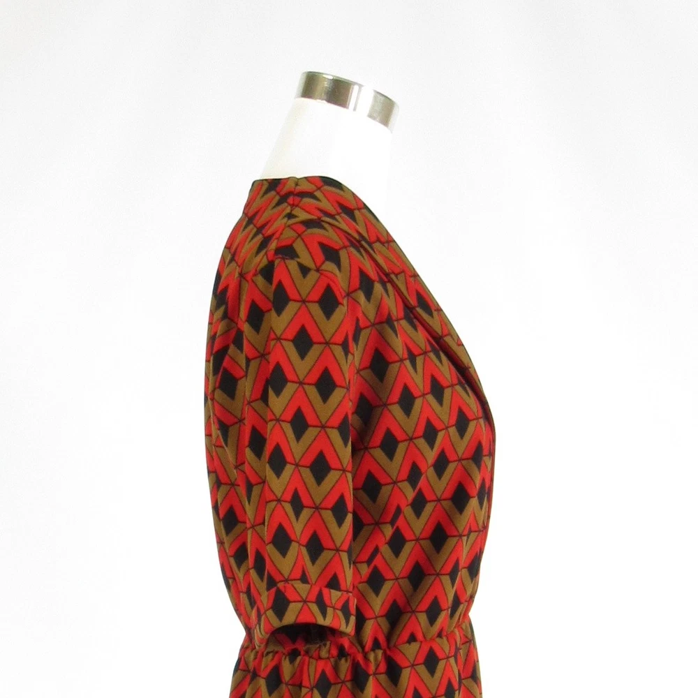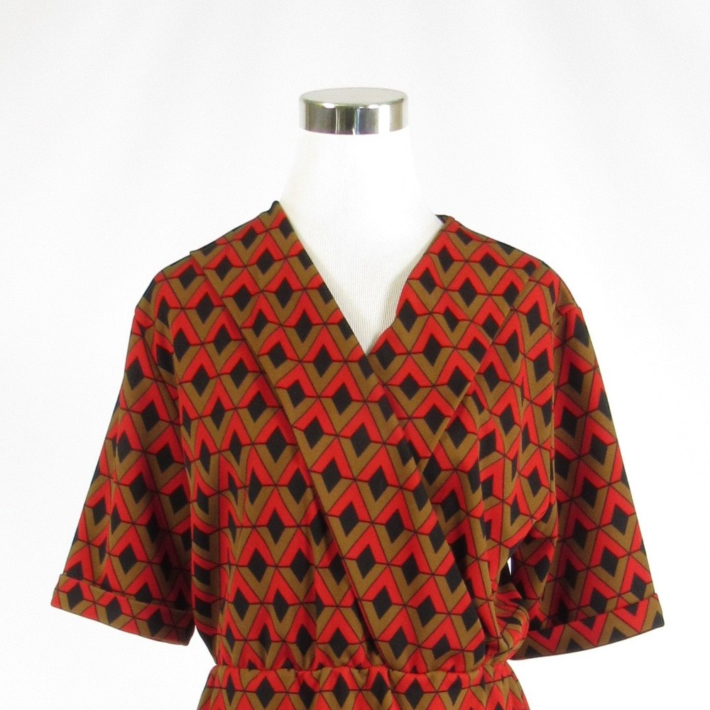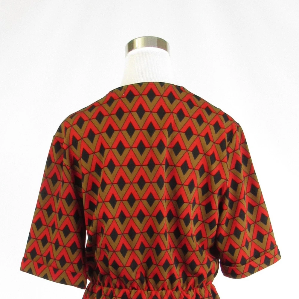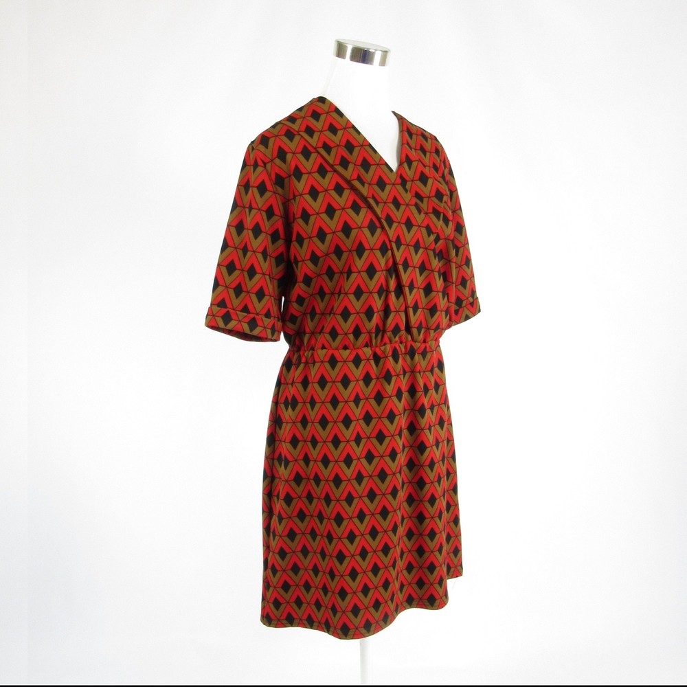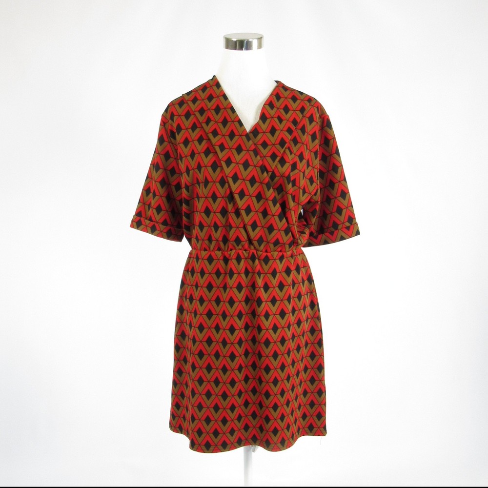 Bright orange, brown, black Diamond Cross-over V-neck 1/2 sleeves with folded cuff A-line Stretch Gathered waist Brand: Tracy Negoshian Size: X-Large Shoulders: 18" Bust: 38" Waist: 28" Hip: 44" Length: 37" Sleeve Length: 11" 95% Polyester, 5% Elastane