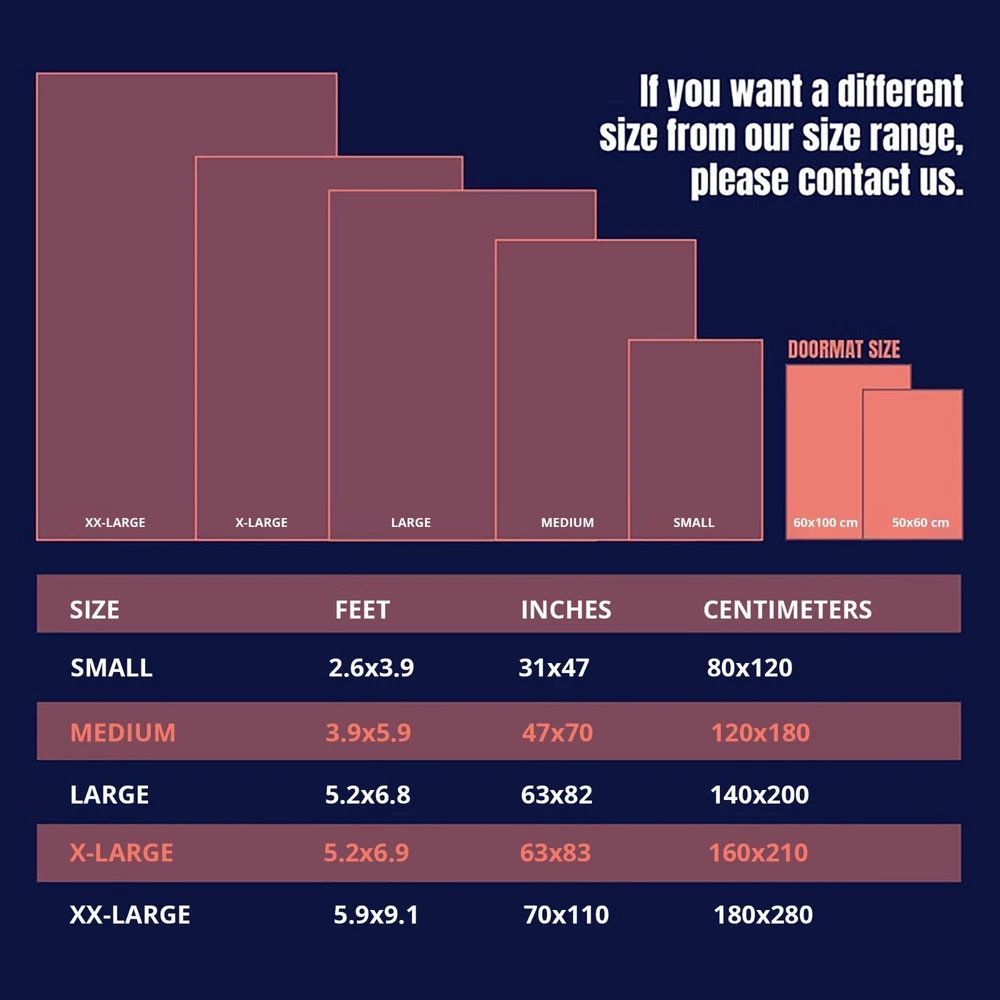 Your imagination is limited in these carpets that we produce and sell. We can print what you want on the carpet. * If you would like to see a photo of your family, a sweet memory of your dog or cat, your logo, your business name, a word you like, or anything on the carpet, please contact us. * The color of these rugs you examine will never fade, they will not lose their vitality, * It has passed the washing tests and has preserved the vitality and brightness of the first day. * It does not contain any harmful substances, you can use it safely and peacefully for your child and yourself. * Hypoallergenic, high quality printed, lint-free washable. * You can make a difference in your home with rugs designed according to your taste. * Since these rugs do not have hairiness or similar disadvantages, you will not have allergies, do not worry. * Our products are produced with 3d digital printing technology. * When you want to wash it, we recommend that you wash it in the washing machine at 30 degrees without wringing. * Our Carpets consist of Non-Slip Cotton Base, Soft Shiny velvety fabric on the top. Carpet thickness 4-5 mm * The edge (overlock) stitch colors of our carpets vary according to the color of the rug. If you have the color you want on the side seams, please specify when ordering. * The cotton non-slip sole can be in different patterns depending on the way of weaving. * Since our carpets use 3d digital printing technology at high temperatures, the dimensions of our rugs can vary by ± 3-4%. * The sample colors you see may differ slightly from our samples depending on the color calibration of your monitor. * The images in the name are sample images of the products. It was put in to show how the carpet looks. Your order will be produced as in the first image. Since our products are specially produced for you from scratch and from the same material, our advertisements are supported with sample images instead of adding real pictures of all our carpets. SIZE INFORMATION 1.64x1.97 ft - 50X60 cm - 20x24 in (Doormat) 1.97x3.28 ft - 60X100 cm - 24x39 inch 2.62x3.94 ft - 80X120 cm - 31x47 inch 2.62x4.92 ft - 80X150 cm - 47x59 in 3.28x4.6 ft - 100X140 cm - 39x55 in 3.28x6.56 ft - 100X200 cm - 39x79 inch 3.94x5.91ft - 120X180 cm - 47x71 inc 4.6x6.56 ft - 140X200 cm - 55x79inches 5.25x6.9 ft - 160X210 cm - 63x83 inch 5.91x9.19 ft - 180X280 cm - 71x110 inch MATERIAL AND GENERAL FEATURES Our products consist of a mixture of Cotton and Microfiber. Hd print quality is used. The sole is cotton non-slip sole. It is washable, Thick and soft, and has hypoallergenic properties. It does not fade when washed. PACKAGING We make transparent packaging as standard so that the carpet is not damaged. CHANGES (DIMENSIONS AND TYPES) We have dimensions for every size, room and outdoor environment. In addition, we can make special production for you in the dimensions you want. You can order in bulk. WHY CHOOSE US We offer the best customer support services. We also deliver in secure packaging to avoid any damage during shipping. You can order with confidence. ------ SHIPPING AND DELIVERY --- * We ship your orders by Express, (FedEx, TNT, DHL, UPS...) * If you are in any country in Europe, the carpet will be delivered to you. within 3-5 working days. * If you are in America or Canada, it will be delivered to you within 3 or 9 days. * Delivery is made to all other countries of the world in an average of 3 - 10 days. ✉ Please feel free to contact me for any questions you may have. RETURN AND EXCHANGE RULES We produce your orders specially for you. These rugs, which are specially produced for you, are delivered to the cargo after passing the quality control, but if there is a problem such as a production error, we take the necessary measures for your satisfaction. We cannot accept returns or exchanges except for these reasons, your safety is our priority, we are very sensitive to fulfill all our duties in this regard, but we respond positively to return requests for non-arbitrary and valid reasons.