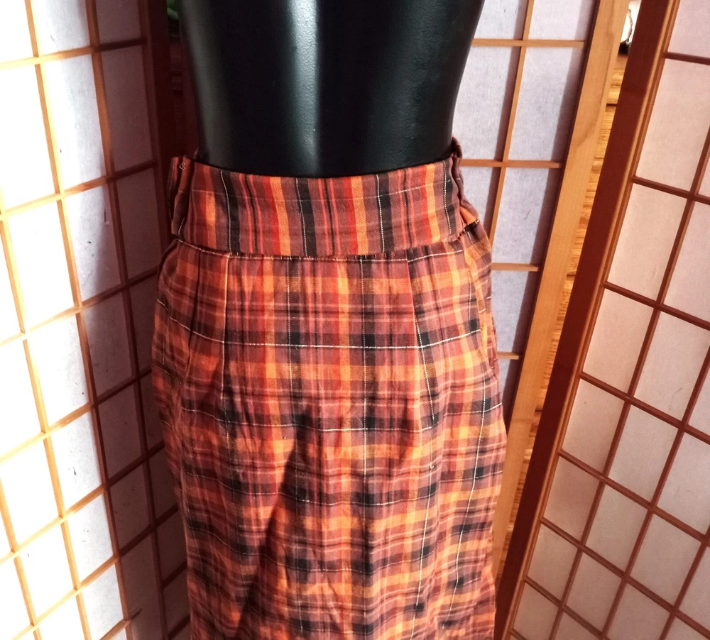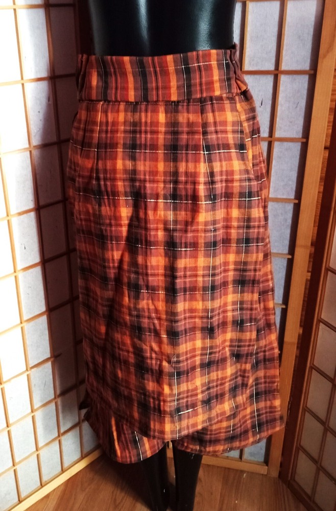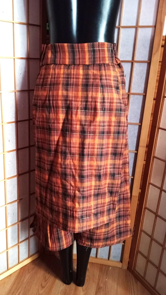 This is a size medium orange and brown plaid skort pants, inspired by the 1950's pants style. This garment can be machine washed cold and hang dry. Pants Measurements: Waist: 28" Hips: 40" Inseam: 15" If you have any questions or would like to see additional pictures, please do not hesitate to contact our shop. Thank you for your time.