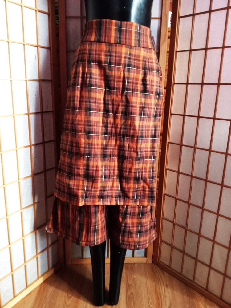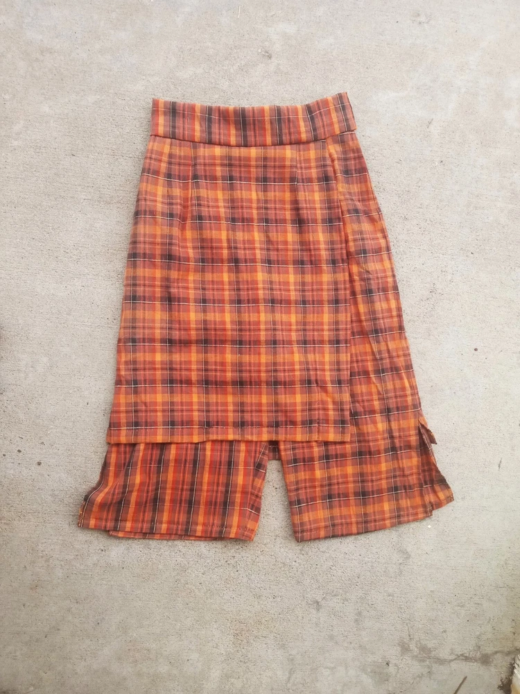 Love this retro-inspired skort! The orange and brown plaid is so stylish, and the fit is perfect—comfy waist, flattering hips, and just the right inseam. Easy to care for, too—just toss it in the wash and hang dry. Great vintage vibes with modern convenience! Would definitely recommend.