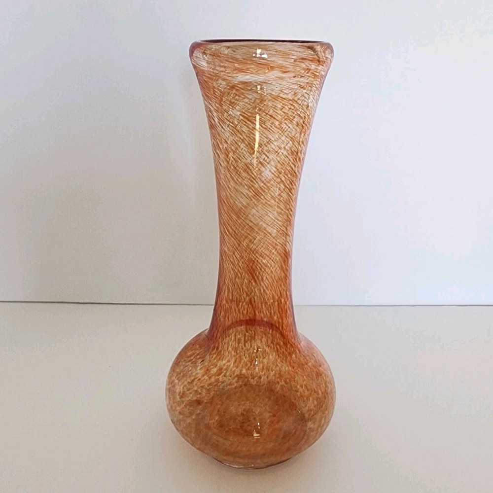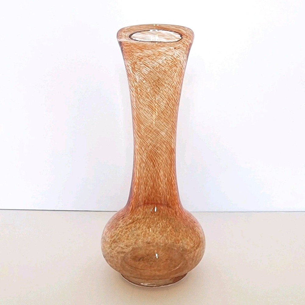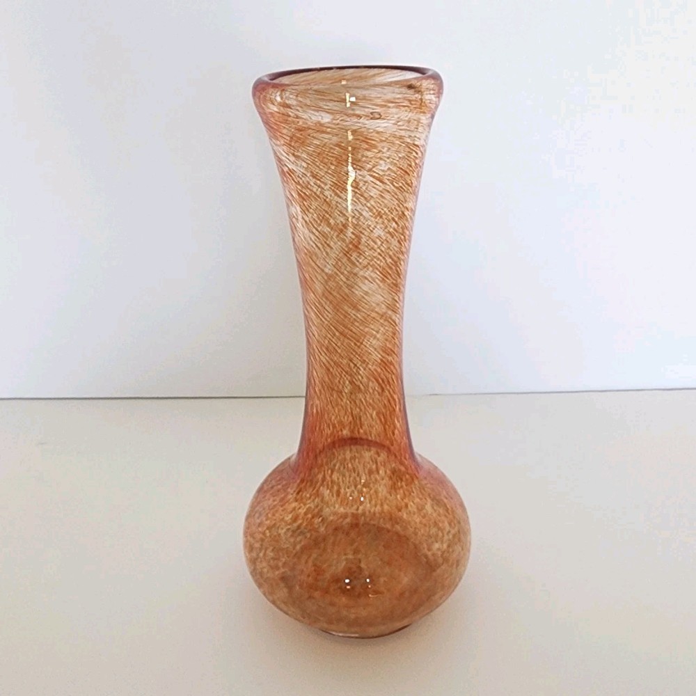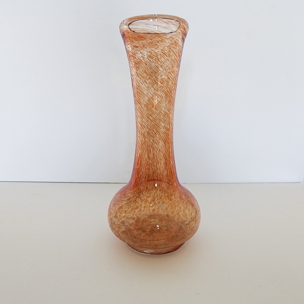 This vintage heavy hand blown glass bud vase has a bulb shape indicative of the mid-century period. The swirl or splatter pattern is made up of orange and peach hues giving this vase a very contemporary vibe. It measures 10" tall.