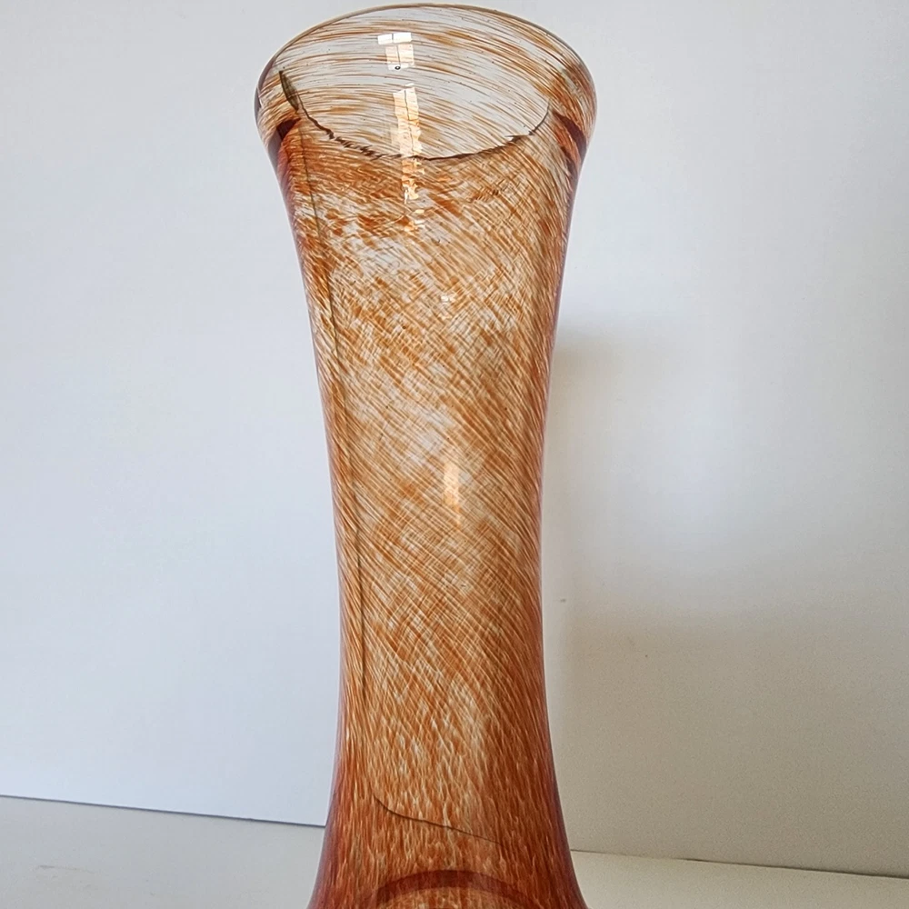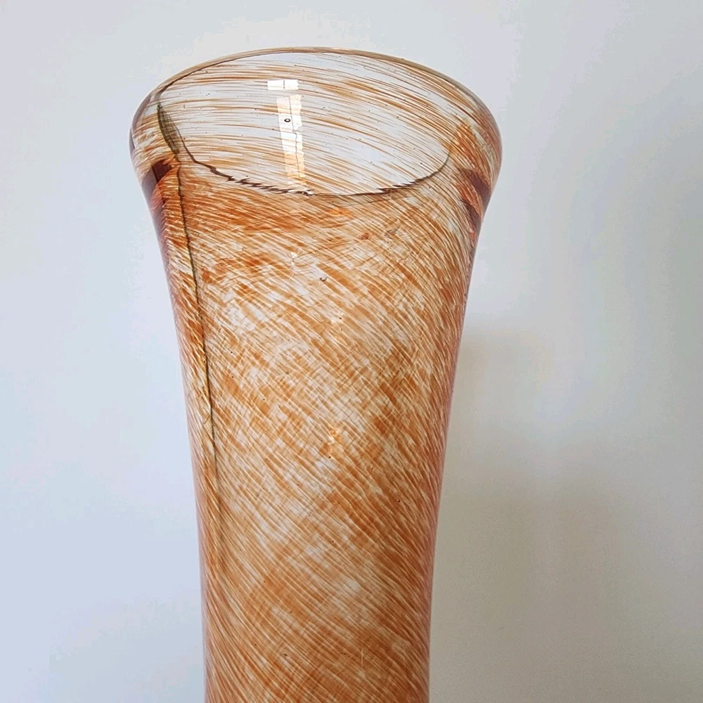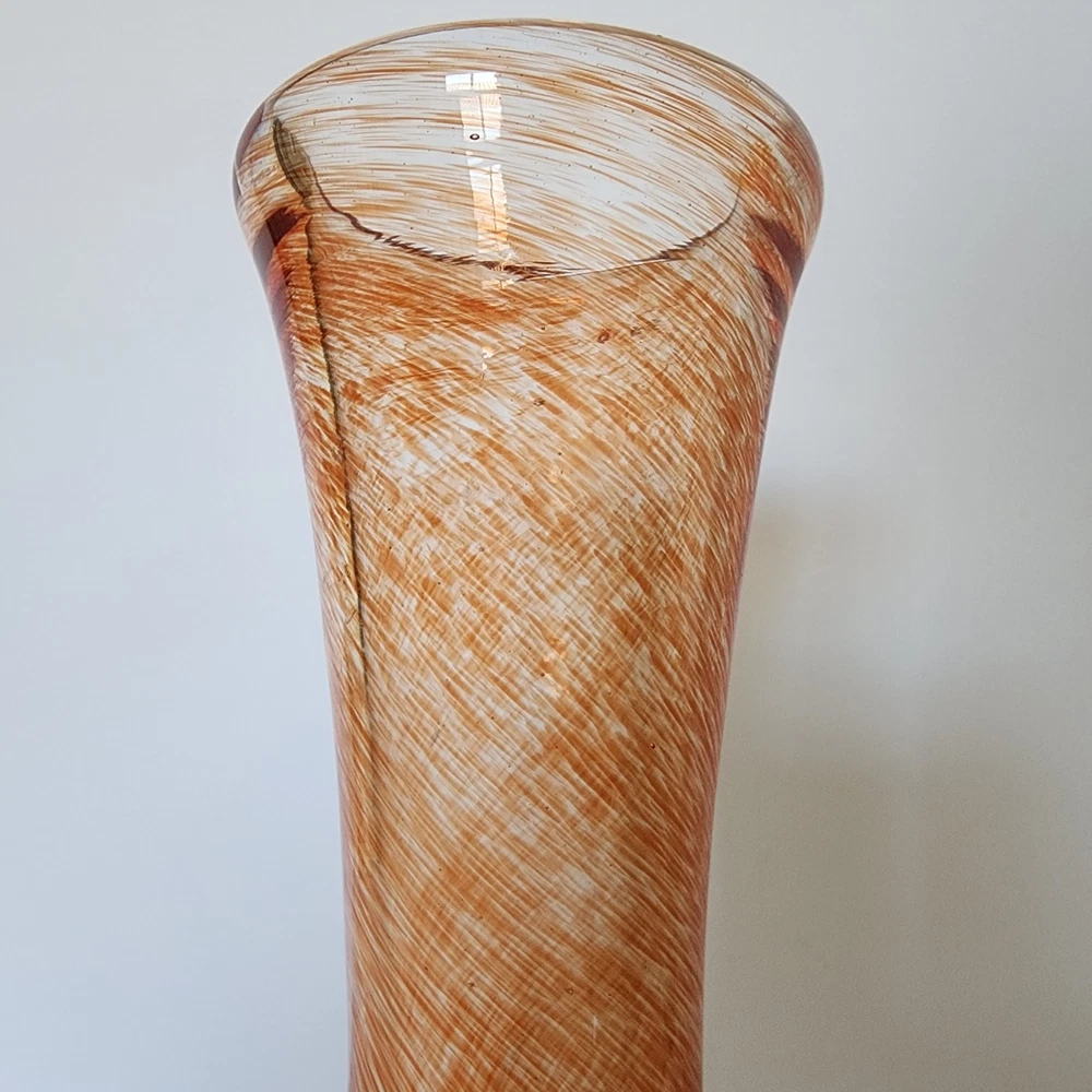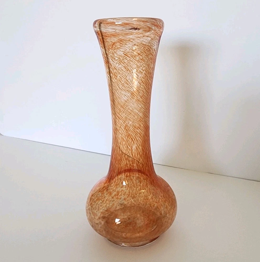 This vintage heavy hand blown glass bud vase has a bulb shape indicative of the mid-century period. The swirl or splatter pattern is made up of orange and peach hues giving this vase a very contemporary vibe. It measures 10" tall.
