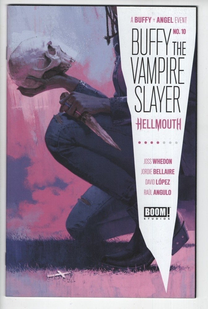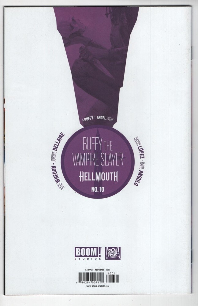 Buffy the Vampire Slayer #10 cover A comic book Hellmouth Joss Whedon Hellmouth: Part 6 of 12 - Written by Jordie Bellaire. Art by David Lopez. Cover by Marc Aspinall. A HELLMOUTH TIE-IN! NOTE : Story continued from Angel (2019 Boom) #7. THE FIRST APPEARANCE OF A NEW SLAYER! With Buffy in Hell, someone new has answered the call to save what's left of Sunnydale. Who is this mysterious new Slayer? And how will the new blood cope with a team made up of a newly empowered witch and a half-human, half-vampire sidekick? 32 pages, full color. NOTE : Story continues in Hellmouth (2019 Boom) A Buffy and Angel Event #3. Cover price $3.99. This comic book is in VERY FINE/ NEAR MINT condition. Each comic book comes in a plastic comic sleeve with an acid free backing board.