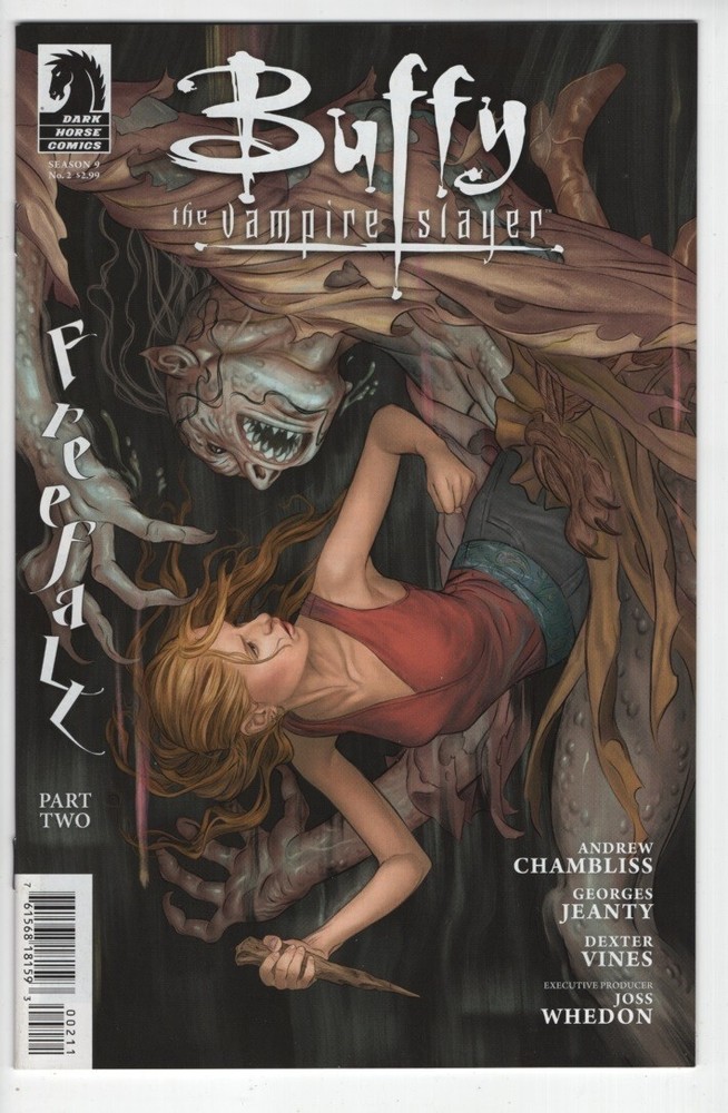 B uffy the Vampire Slayer #2 comic book "Freefall" Part Two Cover by Steve Morris Freefall: Part 2 - Joss Whedon (W), Andrew Chambliss (W), Georges Jeanty (P), Dexter Vines (I), Michelle Madsen Buffy continues her nightly patrols while trying to cobble together a sensible life . . . Willow's adopted a new look, while Dawn and Xander celebrate the comforts of a magicless world. The fun and games come to a halt when mysteriously marked bodies start appearing. As Buffy starts to investigate she captures the attention of San Francisco police detectives who have taken notice of the unnaturally gifted Slayer . . . Written by series creator Joss Whedon, with Andrew Chambliss of Dollhouse and the CW's The Vampire Diaries! Cover price $2.99. This comic book is in VERY FINE/ NEAR MINT condition. Each comic book comes in a plastic comic sleeve with an acid free backing board.