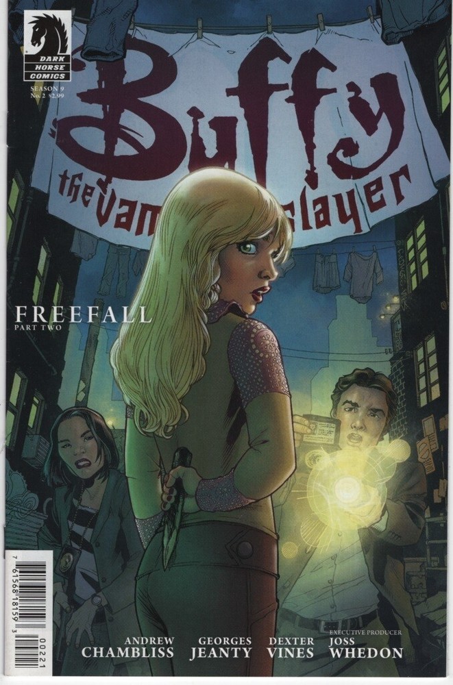 B uffy the Vampire Slayer #2 comic book "Freefall" Part Two Featuring the Buffy the Vampire Slayer #2 cover B comic book . This comic book was published by Dark Horse Comics in 2011. Cover by Georges Jeanty Freefall: Part 2 - Joss Whedon (W), Andrew Chambliss (W), Georges Jeanty (P), Dexter Vines (I), Michelle Madsen Buffy continues her nightly patrols while trying to cobble together a sensible life . . . Willow's adopted a new look, while Dawn and Xander celebrate the comforts of a magicless world. The fun and games come to a halt when mysteriously marked bodies start appearing. As Buffy starts to investigate she captures the attention of San Francisco police detectives who have taken notice of the unnaturally gifted Slayer . . . Written by series creator Joss Whedon, with Andrew Chambliss of Dollhouse and the CW's The Vampire Diaries! Cover price $2.99. This comic book is in VERY FINE / NEAR MINT collector’s condition, and comes in a plastic comic sleeve with an acid-free backing board. An essential for any BUFFY THE VAMPIRE SLAYER, ANGEL, FIREFLY, SERENITY, JOSS WHEDON fan or collector. Please check out our other BUFFY COMIC BOOK AUCTIONS . We will combine shipping on multiple winning items. Shipping is via USPS MAIL and includes insurance within the United States.