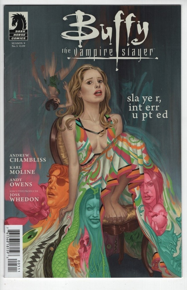Buffy Vampire Slayer Season 9 #5 cover A comic book TV show series Joss Whedon Cover by Steve Morris Andrew Chambliss (W), Karl Moline (P), Andy Owens (I), Michelle Madsen Buffy's dreams have become all too real lately as she deals with a magicless world. She's still fighting creatures of the night, as Willow and Xander grow distant and nightmares plague the Slayer. But something is telling Buffy that there is more to her dreams than meets the eye . . . and that her greatest fears may yet become reality! Cover price $2.99. This comic book is in VERY FINE/ NEAR MINT condition. Each comic book comes in a plastic comic sleeve with an acid free backing board