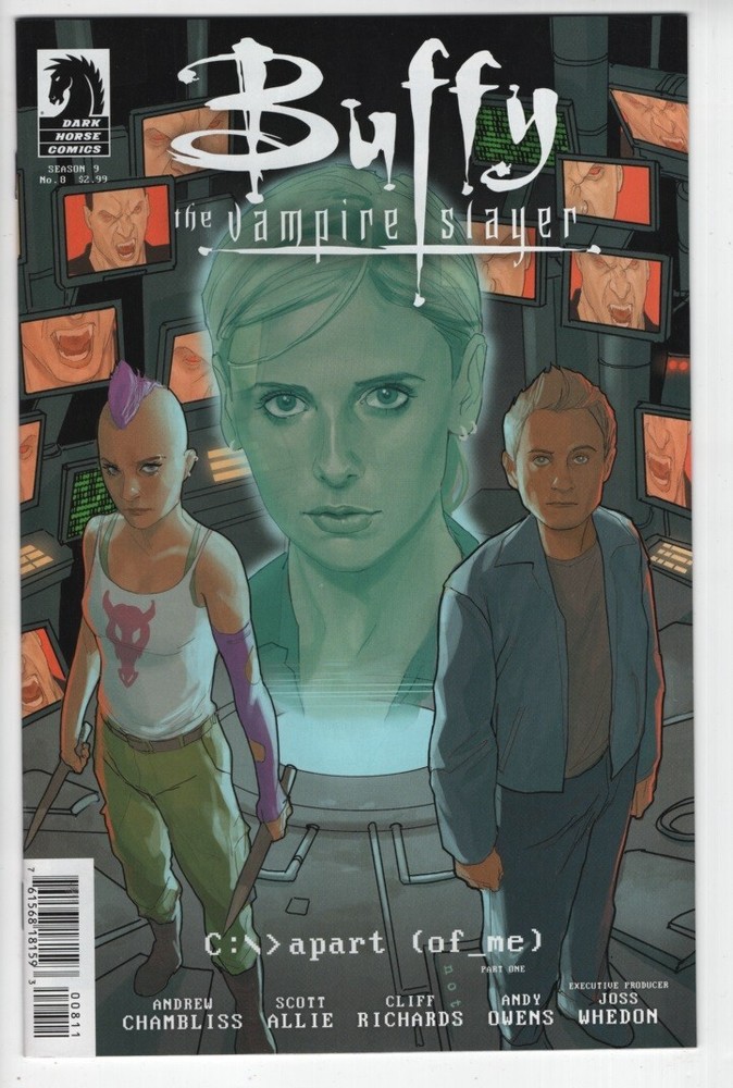 Buffy Vampire Slayer Season 9 #8 cover A comic book TV show series Joss Whedon Apart (of Me): Part 1 - (W) Andrew Chambliss (A) Andy Owens, Cliff Richards (CA) Michelle Madsen, Phil Noto There is something seriously wrong with Buffy! She and Spike discover that the one person who can help her is actually . . . Andrew? Buffy's situation becomes even more dire as she discovers that Simone, the Slayer with an enormous grudge, has been targeting her. Cover price $2.99. This comic book is in VERY FINE/ NEAR MINT condition. Each comic book comes in a plastic comic sleeve with an acid free backing board.