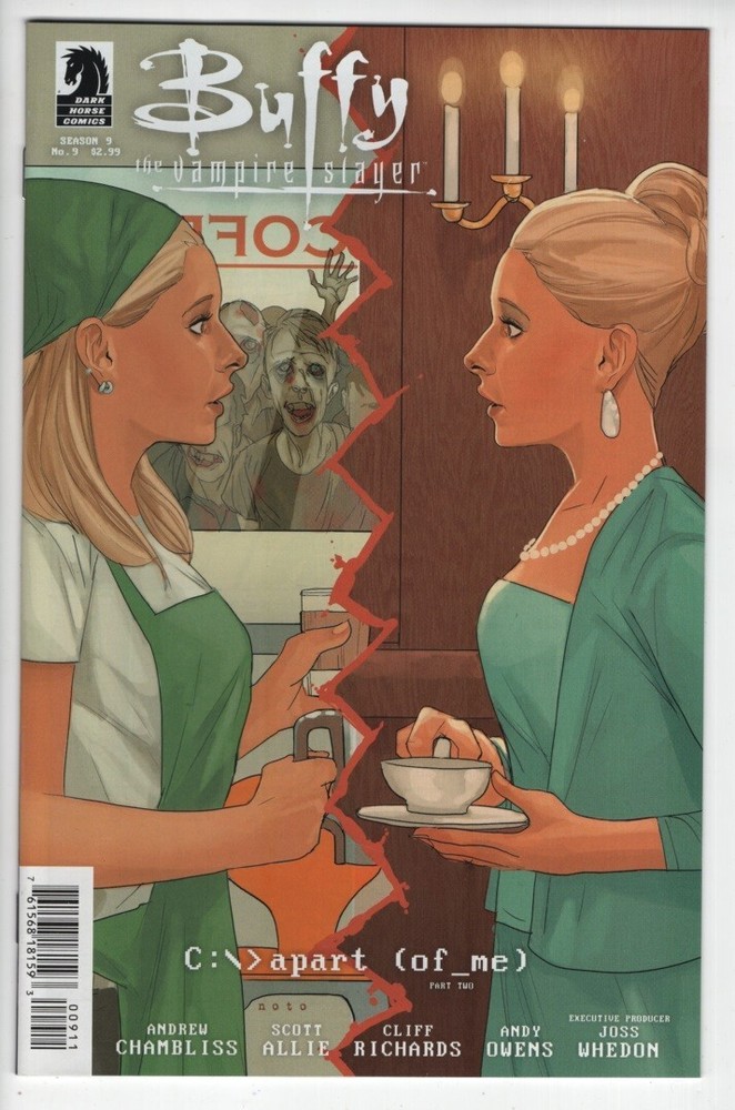 Buffy Vampire Slayer Season 9 #9 cover A comic book TV show series Joss Whedon Cover by Phil Noto Apart (of Me): Part 2 - (W) Andrew Chambliss, Scott Allie (A) Andy Owens, Cliff Richards Andrew doesn't always make the best choices (see Season 6). And now Buffy finds herself and the very course of her life profoundly affected by one of Andrew's over-the-top, idiotic . . . hair-brained . . . schemes. Together with Andrew and Spike, the worried Slayer will have to confront herself and her comrades, as well as a long-standing annoyance, the number-one Buffy hater of all Buffy haters: Simone, the gun-toting Slayer. Cover price $2.99. This comic book is in VERY FINE condition. Each comic book comes in a plastic comic sleeve with an acid free backing board.