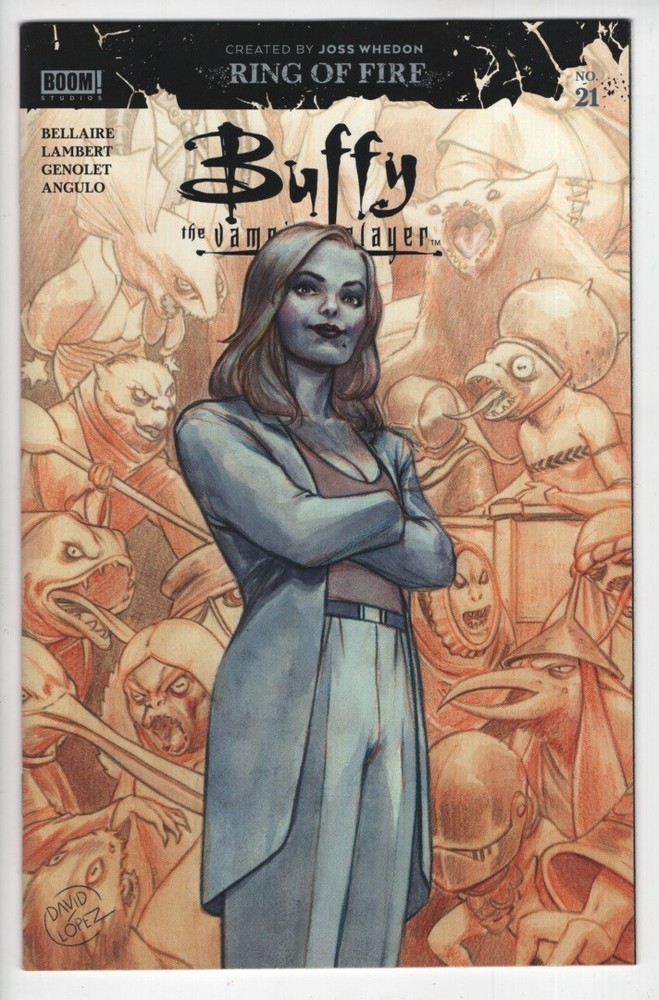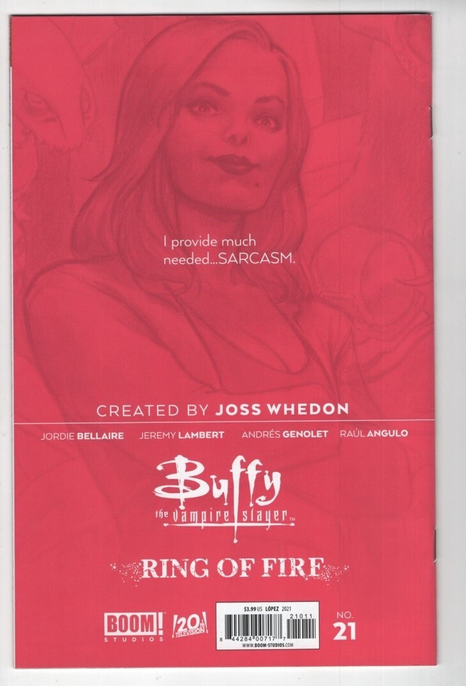 Buffy the Vampire Slayer #21 cover A comic book Ring of Fire Joss Whedon Written by Jordie Bellaire and Jeremy Lambert. Art by Andres Genolet. Cover by David Lopez. Anya has been a key figure in Buffy's life ever since she arrived in Sunnydale, but there's more to the demon's mission and mysterious past than anyone knows! It starts with her secret connection to the Watcher's Council and... the first full appearance of the Slayer who came before Buffy? And the truth behind Anya connects Buffy(s) - yes, plural - in ways no one ever saw coming... 24 pages, full color. Cover price $3.99. This comic book is in VERY FINE/ NEAR MINT condition. Each comic book comes in a plastic comic sleeve with an acid free backing board.