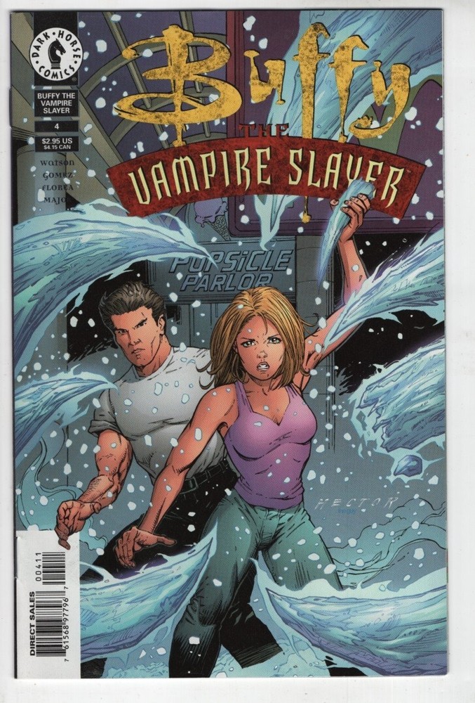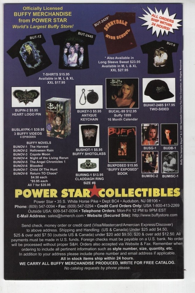 Buffy the Vampire Slayer #4 art cover comic book White Christmas Created by Joss Whedon. Written by Andi Watson. Art by Hector Gomez and Sandu Florea. Cover by Hector Gomez. Dashing through the snow, in a one horse open slay! The comics adaption of the hit television show continues as the Yuletide rolls into Sunnydale. A puzzling heat wave is the least of Buffy's concerns when she realizes she does not possess the monetary means to afford the holiday season (or a new dress for the Winter Dance!). To add insult to injury, she is forced to get a job in the mall to pay for her expenditures. All would be well, though, if she didn't have to wear a paper hat and if her employer wasn't quite so "cold" toward her . . . Hector Gomez, artist of October's Buffy: The Dust Waltz graphic novel, steps in for this special fill in! 32 pages, FC. Cover price $2.95. This comic book has been preserved in VERY FINE collector’s condition, and comes in a plastic comic sleeve with an acid-free backing board. An essential for any BUFFY THE VAMPIRE SLAYER, FIREFLY, SERENITY, JOSS WHEDON fan or collector. Please check out our other BUFFY THE VAMPIRE SLAYER and SERENITY comic book auctions. We will combine shipping on multiple winning items. Shipping is via USPS MAIL and includes insurance within the United States.