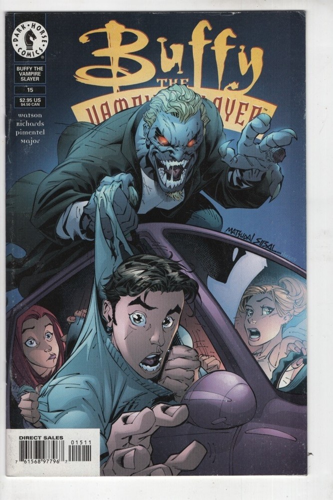 Buffy the Vampire Slayer #15 art cover comic book Lost Highway Bad Blood: Part 7 of 11 - Created by Joss Whedon. Written by Andi Watson. Art by Cliff Richards and Joe Pimentel. Cover by Jeff Matsuda. She alone will stand against the vampires . . . the demons . . . and the forces of Darkness . . . wait, she can't even drive yet! Learning how to operate an automobile is a rite of passage that all teenagers face, the Chosen One being no different. And while Buffy faces the horrors of Drivers' Ed., Selke and the Doctor are busy breeding disaster for Sunnydale. Does their evil alchemy spell disaster for Buffy and the gang? Have we seen the last of the super-vampires that have plagued Sunnydale lately? Will Buffy get her driving permit?! There's only one way to find out! 32 pages, FC. Cover price $2.95 This comic book has been preserved in FINE / VERY FINE collector’s condition, and comes in a plastic comic sleeve with an acid-free backing board. An essential for any BUFFY THE VAMPIRE SLAYER, FIREFLY, SERENITY, JOSS WHEDON fan or collector. Please check out our other BUFFY THE VAMPIRE SLAYER and SERENITY comic book auctions. We will combine shipping on multiple winning items. Shipping is via USPS MAIL and includes insurance within the United States.