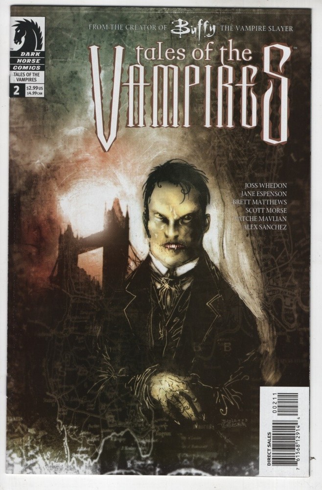 Buffy the Vampire Slayer Tales of the Vampires #2 comic book Joss Whedon JOSS WHEDON, JANE ESPENSON, SCOTT MORSE, and more cover by BEN TEMPLESMITH Joss Whedon, the creator of Buffy the Vampire Slayer reunites with Brett Matthews, with whom he wrote the Angel comics series, and Jane Espenson, longtime writer of the TV series, as they continue this bizarre look at the lives of vampires in the world of Buffy and the Slayers. Whedon and newcomer Alex Sanchez continue their framing sequence, in which a group of young Watchers-in-training learn the secrets of the undead from an ancient vampire kept in chains in the basement of the Watchers Council. Scott Morse (Ancient Joe, Barefoot Serpent) illustrates Jane Espenson's poem "Spot the Vampire," a cross between a New Yorker cartoon and a children's book, in which evil hides in plain sight. And the centerpiece of the issue is the fourteen page "Jack" story by Spider- man/Wolverine creative team Brett Matthews and Vatche Mavlian?a Victorian vampire mystery. Under a cover by Cal McDonald and 30 Days of Night artist Ben Templesmith, the second installment of Tales of the Vampires digs deeper into the dark side of Joss Whedon's girl empowerment myth. Cover price $2.99. This comic book is in VERY FINE/ NEAR MINT condition. Each comic book comes in a plastic comic sleeve with an acid free backing board.