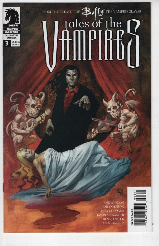 Buffy the Vampire Slayer Tales of the Vampires #3 comic book Joss Whedon JOSS WHEDON (W), JANE ESPENSON (W), DREW GODDARD (W), JASON ALEXANDER (P/I), and others ERIC POWELL (cover) The writers of the legendary television series Buffy the Vampire Slayer reunite for this chilling five-issue series, masterminded and overseen by Joss Whedon himself! In this issue, Drew Goddard pokes fun at the King of Vampires, Dracula. Jane Espenson looks at the bond between a vampire father and his aging son, and Joss Whedon continues his ongoing story of young watchers in training as they meet their first vampire. Cover price $2.99 This comic book is in VERY FINE/ NEAR MINT condition. Each comic book comes in a plastic comic sleeve with an acid free backing board.