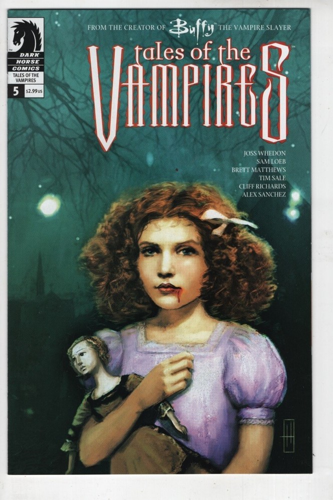Buffy the Vampire Slayer Tales of the Vampires #5 comic book Joss Whedon JOSS WHEDON (W), ALEX SANCHEZ (A), BRETT MATTHEWS (W), SAM LOEB (W), and others, BRIAN HORTON (Cover) Joss Whedon wraps up his Tales of the Vampires series, finally revealing the truth behind the young Watchers' training program and their introduction to their ancient vampire tutor. Brett Matthews (Spiderman/Wolverine) returns with a story of Buffy's favorite vampire? Angel. Cover price $2.99. This comic book is in VERY FINE/ NEAR MINT condition. Each comic book comes in a plastic comic sleeve with an acid free backing board.