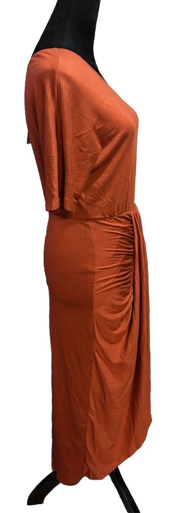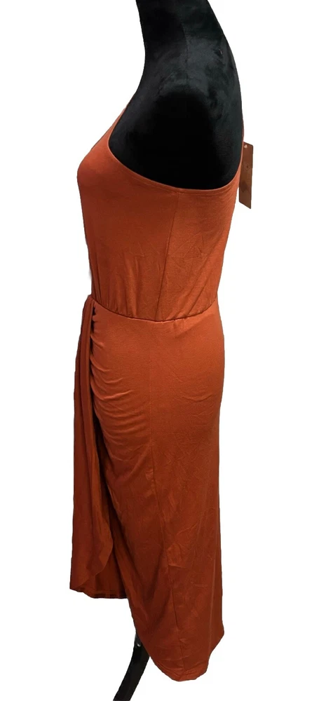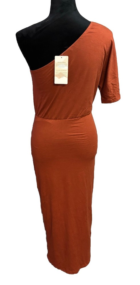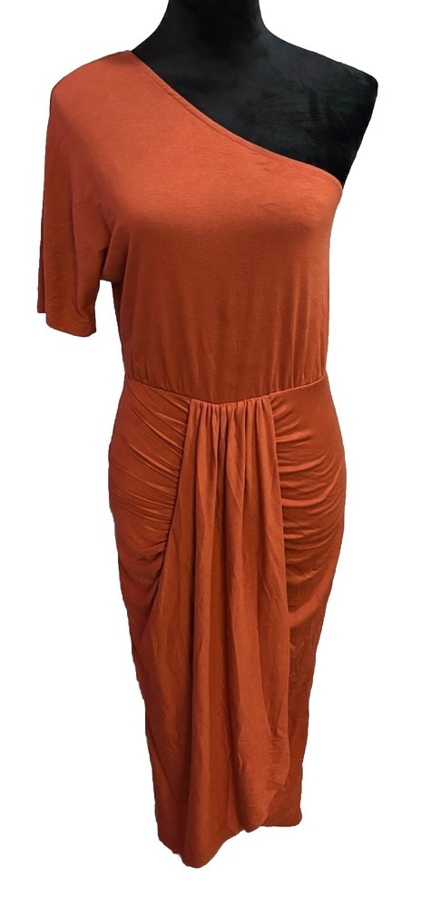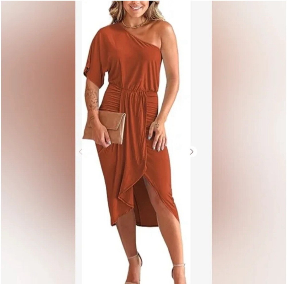 Make a statement at your next party or while traveling with this stunning burnt orange dress from Fashion. This color is perfect for fallThe dress features an asymmetrical design with ruched detailing on one shoulder, making it a unique addition to your wardrobe. Its bodycon style is perfect for flattering your figure, while the knee-length cut and short sleeves make it appropriate for both summer and spring occasions. Crafted from a blend of polyester, spandex, and viscose, this dress is both comfortable and machine washable. Its one-shoulder neckline and pullover closure add to its effortless style, making it a must-have for any fashion-forward woman. This dress is available in size S and is perfect for those who want to stand out from the crowd. 65% polyester 30% viscose 5% Spandex One shoulder asymmetric neckline this style of dress has the glamor of a long dress and the comfort of a short one All measurement are taken while lying flat in do my best to be as accurate as possible. Shoulder to hem: 35 inches Bust: 36 inches Waist: 28 inches. Size is a small New With tags Please message me if you have any questions