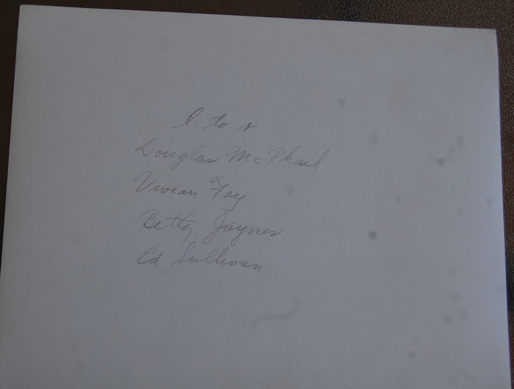 Here is an original glossy publicity still from Ed Sullivan's production Stardust Cavalcade in 1940. This photo has Douglas McPhail, Vivian Fay, Betty Jaynes and Ed Sullivan. Names are written on the back in pencil. 8" X 10" I don't know why the photo of the back looks like there are spots on the back, I don't see any! Buy from a trusted and reliable seller. I source my items from estate sales, thrift shops, auctions and yard sales. My home is non-smoking and pet-friendly but I cannot vouch for their original homes.