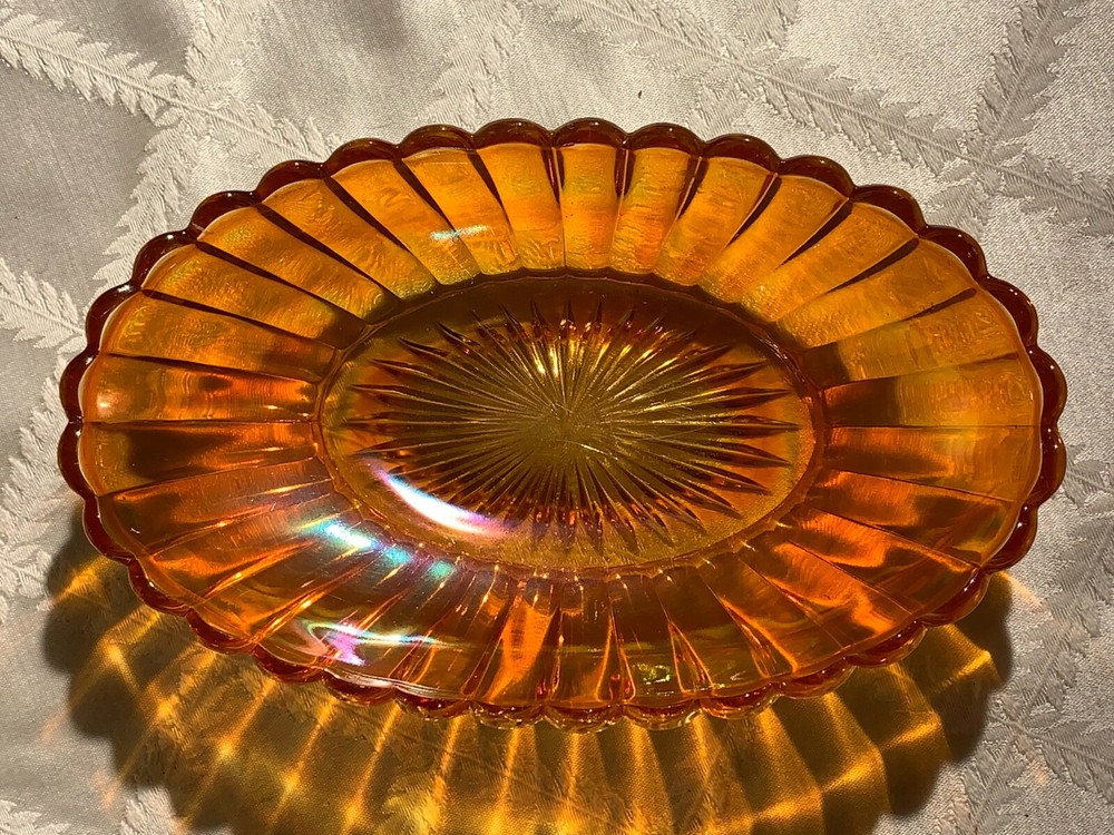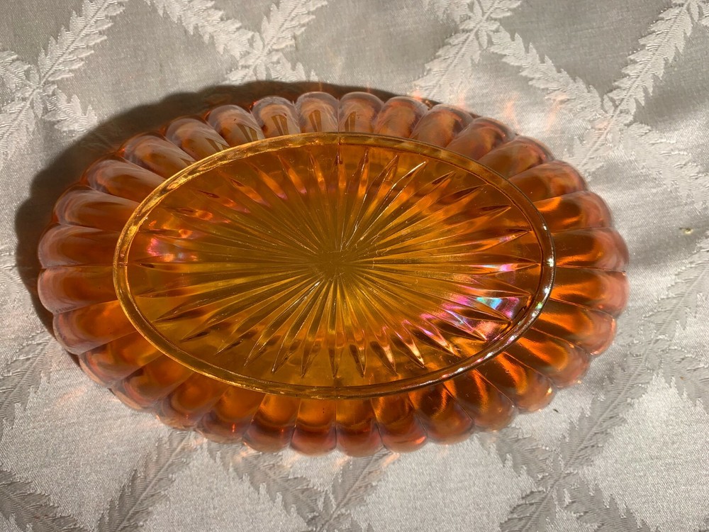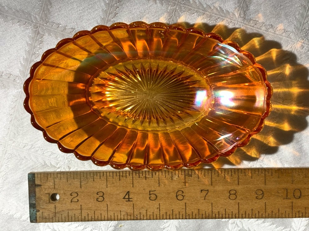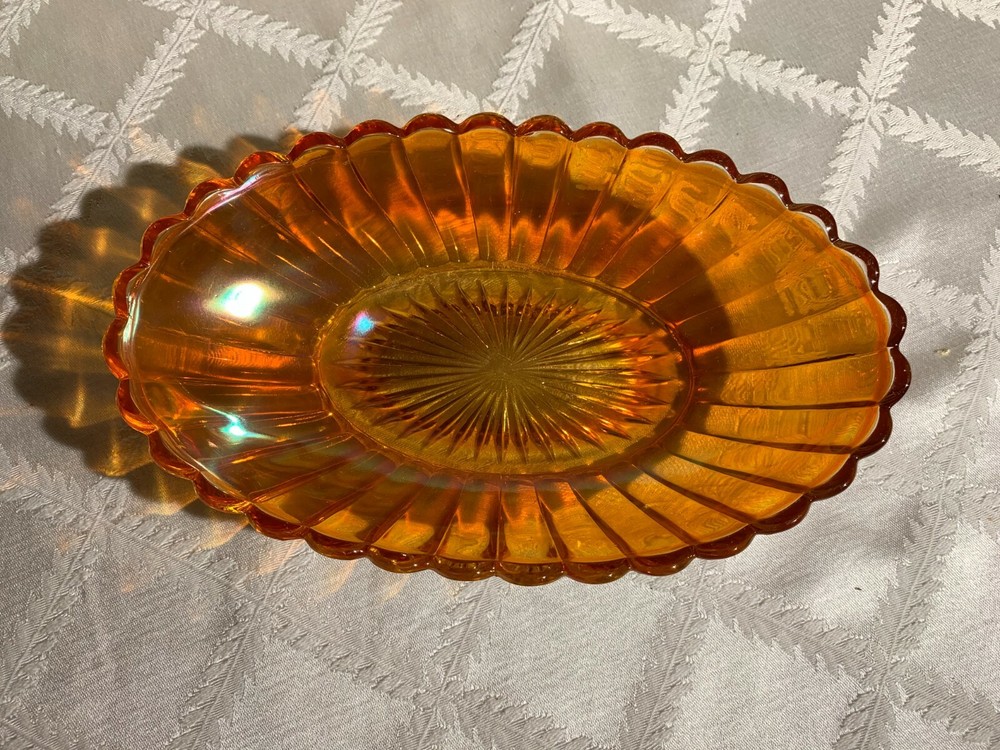 Add a touch of vintage charm to your dining table with this beautiful iridescent orange marigold Carnival Glass serving bowl. The hand-blown bowl features a stunning oval shape and a scalloped edge design, perfect for all occasions and mid-century modern décor. The glossy finish adds a luxurious touch while the hand-wash only care instruction ensures the longevity of this vintage original piece. Measuring 8.25" in length, 5" in width, and 2" in height, it is perfect for serving your favorite dishes. The unmarked brand and unknown origin add to the mystique of this one-of-a-kind bowl, making it a unique addition to your decorative cookware collection. Please examine all photos before purchase. Item is not new. This is a found item, buyer does not know the exact origin of the piece.
