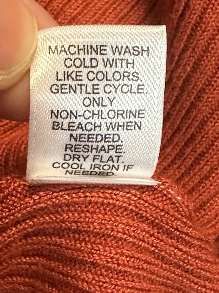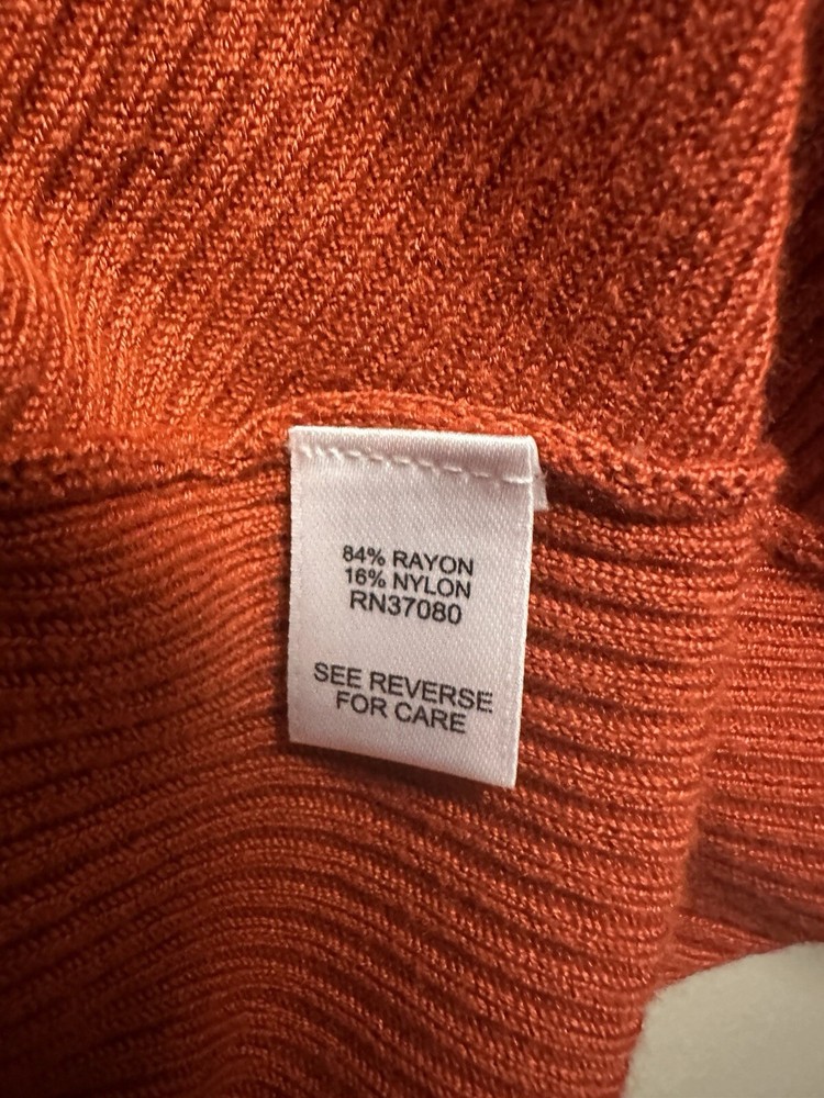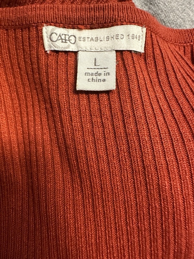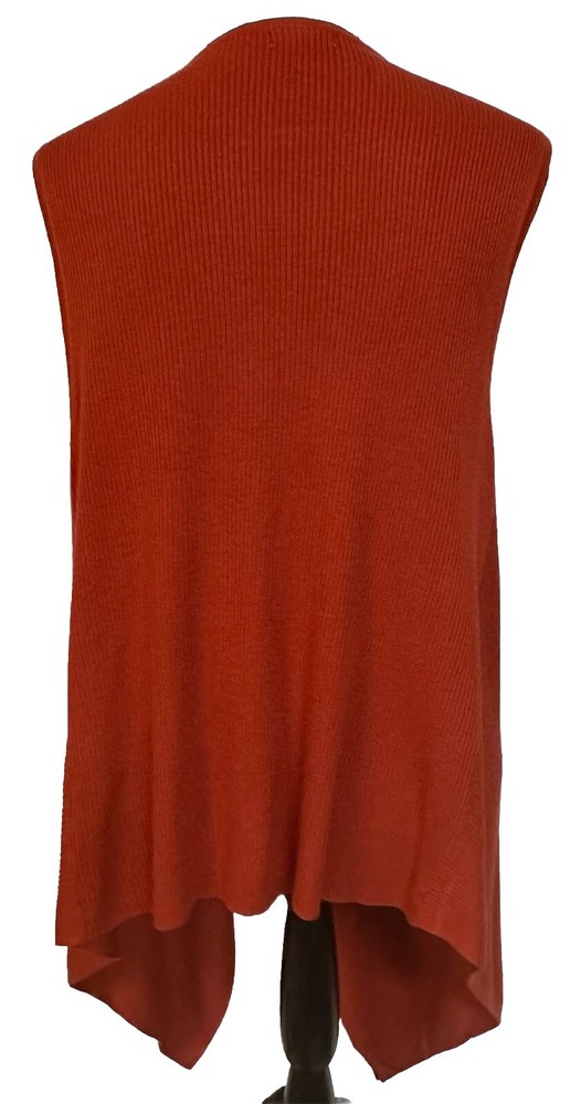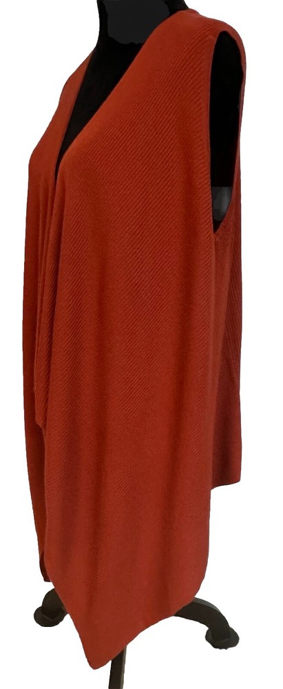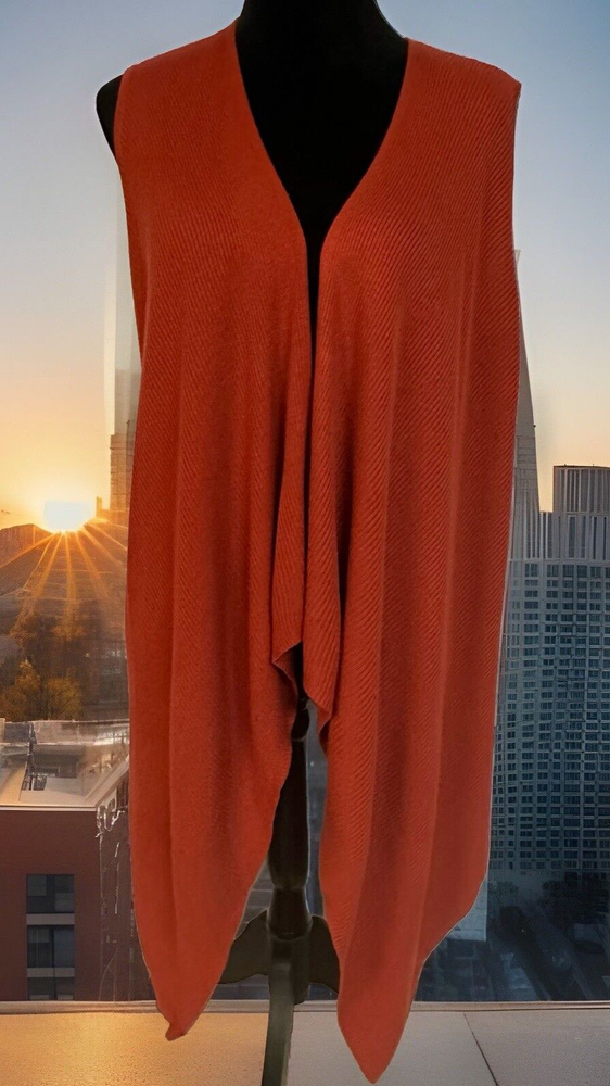 CATO Misses Large Burnt Orange Asymmetrical Mid-length Open Cardigan. Very soft. See photos. #5239 This is a Cato burnt orange asymmetrical mid-length open cardigan in size L for women. The sleeveless vest features a solid pattern, relaxed fit, and is made of rayon/nylon fabric. It is suitable for travel, casual, or business occasions, and is machine washable. The bohemian-themed vest is ideal for winter, fall, or spring seasons.