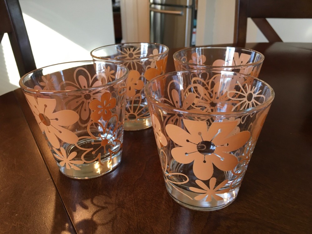 CERVE Italy Mid Century Mod Flower Power Lowball Glasses Orange-set of four (4). Pristine-appear unused. Ships USPS Ground Advantage.