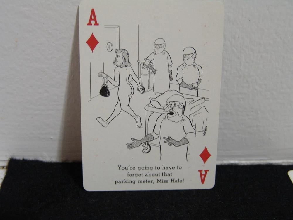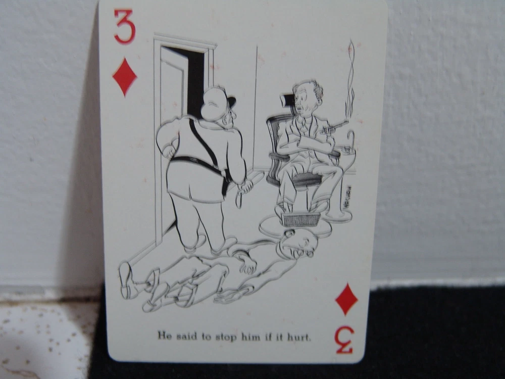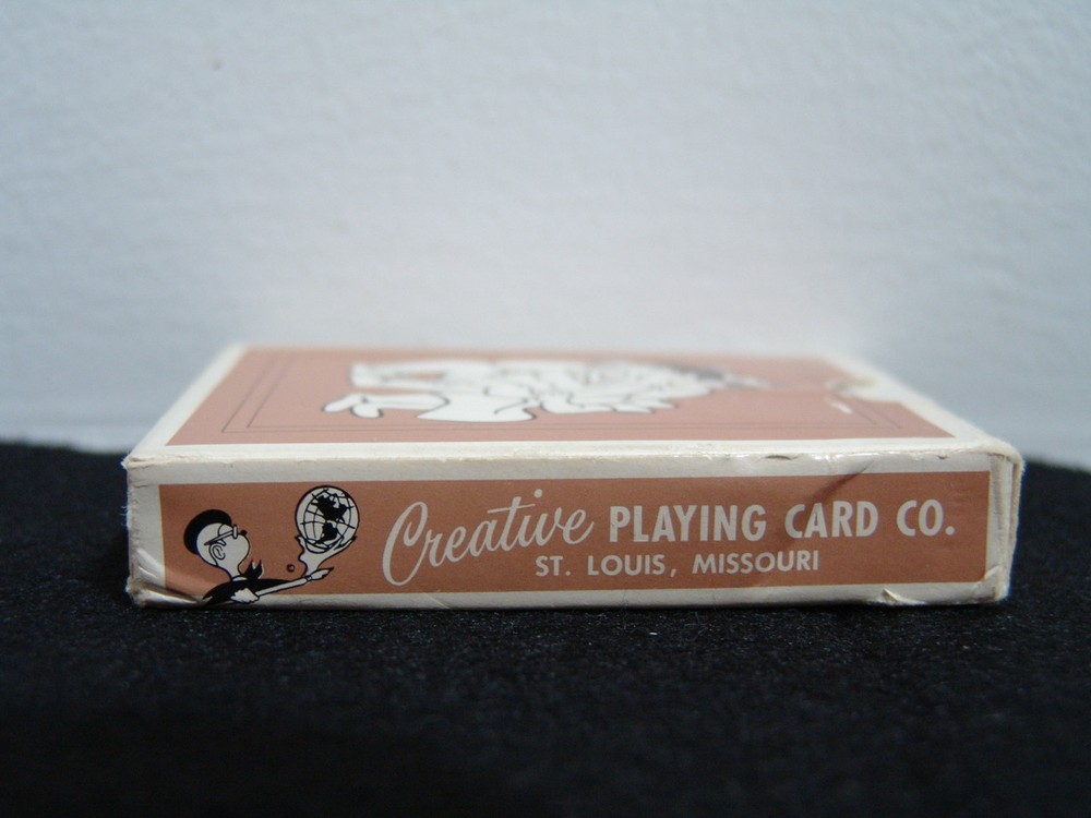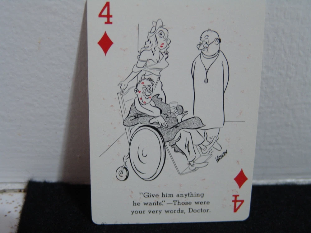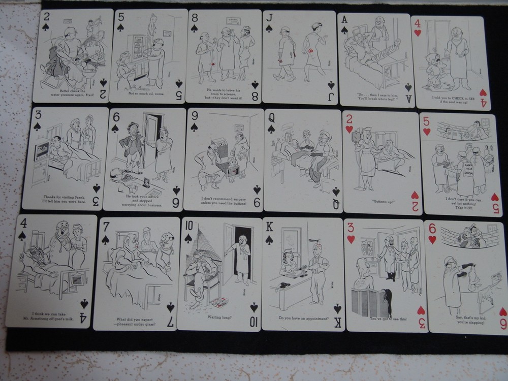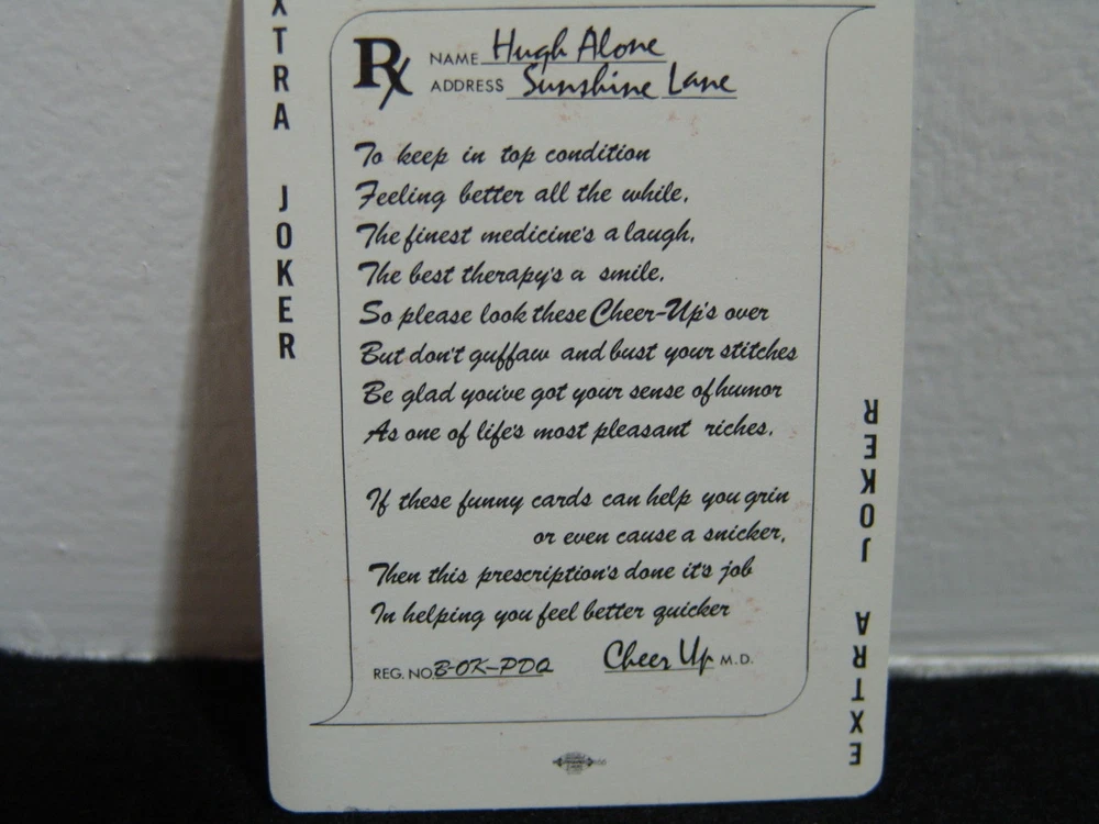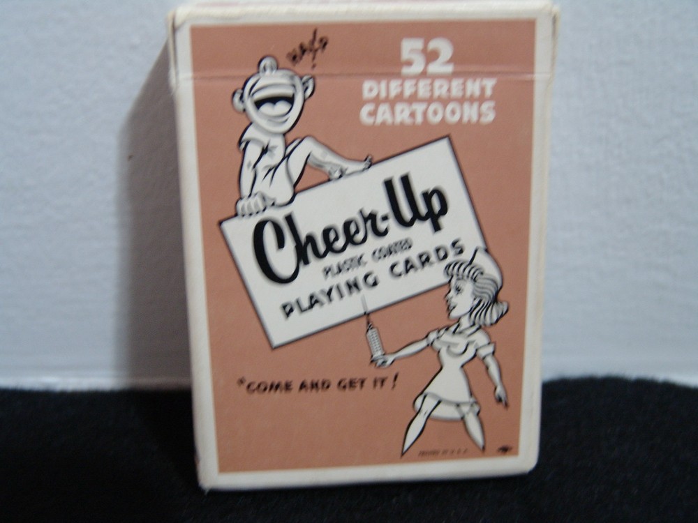 FOR SALE A SET OF PLASTIC COATED PLAYING CARDS TO CHEER YOU UP!! THERE ARE 52 DIFFERENT CARTOONS AND 2 JOKERS, TOTAL IF 54 CARDS, MADE BY THE CREATIVE PLAYING CARD CO, ST LOUIS, MO, IN THEIR ORIGINAL BOX. THE CARDS ARE IN EXCELLENT CONDITION, THE BOX IS GOOD USED CONDITION. PLEASE SEE PICTURES. ONE OF THE JOKERS READS AS FOLLOWS: TO KEEP IN TOP CONDITION FEELING BETTER ALL THE WHILE, THE FINEST MEDICINE'S A LAUGH, THE BEST THERAPY'S A SMILE. SO PLEASE LOOK THESE CHEER-UP'S OVER BUT DON'T GUFFAW AND BUST YOUR STITCHES BE GLAD YOU'VE GOT YOUR SENSE OF HUMOR AS ONE OF LIFE'S MOST PLEASANT RICHES. IF THESE FUNNY CARDS CAN HELP YOU GRIN OR EVEN CAUSE A SNICKER, THEN THIS PRESCRIPTION'S DONE IT'S JOB IN HELPING YOU FEEL BETTER QUICKER. REALLY CUTE SET!! A GREAT GET WELL GIFT!! Thank you for considering my merchandise for sale. TERMS AND CONDITIONS ARE AS FOLLOWS: 1. All sales will be considered final, positively no returns, refunds or re-negotiating purchase price. NOTICE: Bid only if you want to own what I’m offering for sale, and have the means to pay for it! 2. All merchandise is offered for sale in an, as is, where is, condition without any warranty whatsoever, implied or expressed. I will accurately describe each item for sale, in detail. If you are unclear or unsure of my description, don’t hesitate to ask for clarification. I will be more than happy to provide any additional information that I can, so you are comfortable with the knowledge of exactly what you are bidding on. It will be necessary for you to ask any and all questions in a timely fashion. 3. Merchandise will be shipped within 48 hours in most cases, upon receipt of payment. Shipping is FREE within the continental United States. Payment is expected within 5 working days after notification. No item will be shipped prior to receipt of payment in full. 4. Approved payment forms are Pay Pal ONLY. I welcome you to ADD ME TO YOUR FAVORITE SELLERS LIST, as I have an obscene quantity of premium merchandise that I wish to sell to the highest bidder on ebay. Let there be no doubt, when I list an item, it is indeed for sale, not simply to achieve an appraisal value. Feel free to visit FROMTHEBARNYARD and store often, and bid freely, as there will indeed be bargains. I am looking forward to doing business with many ebayers. I appreciate you considering purchasing my merchandise. Thank you.