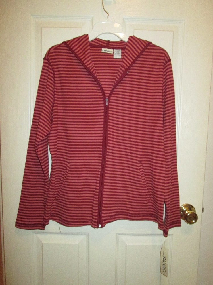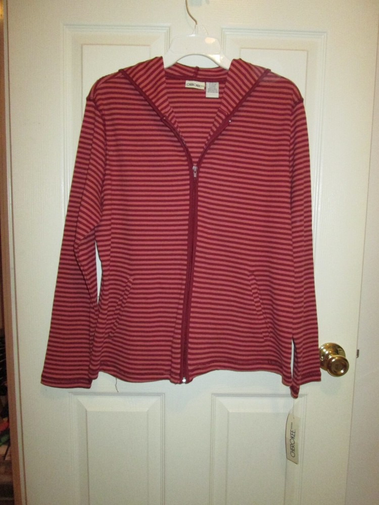 The Cherokee Ladies Hooded Stretch Knit Jacket is a mid-length track jacket made of 97% cotton and 3% spandex. It features a red/orange striped pattern, long sleeves, and a full zip closure. The jacket is perfect for travel, activewear, and casual occasions. It is a vintage piece with a regular fit and is available in size L. The jacket has easy care, stretch, and all-season features, making it suitable for winter, summer, fall, and spring. The American 90s-themed jacket is brand new with tags. Measures 21 inches from armpit to armpit and 25 inches from shoulder to hem sleeves are 24 inches. TERMS & CONDITIONS OF SALE – MUST READ & AGREE TO PRIOR TO BIDDING WARRANTY & CONDITION OF ITEMS SOLD: All items are sold "AS IS, WHERE IS”, with NO WARRANTY expressed or implied. No representation is made of any item(s) sold to be fit for a particular purpose and no liability is assumed for its use or misuse. Descriptions are believed to be accurate but are not guaranteed. LIABILITY: The Seller shall not be held responsible or liable for any injuries or damages, whether incidental or consequential, associated in any way with the item(s). The Seller’s liability shall be limited to the refund of the Bidder’s purchase price. PAYMENT: PayPal payments from Bidders paying in U.S. dollars are accepted. PAYMENTS ARE EXPECTED WITHIN 4 DAYS OF AUCTION’S CLOSE and WILL be required immediately when using Buy-It-Now. Contact Seller if other payments arrangements are desired. SHIPPING: Items will be shipped to U.S only. RETURNS: NOT ACCEPTED however may be Accepted within 30 days of purchase at seller discretion. Please return all items received in original packaging to Seller promptly. Bidder’s purchase price will be refunded upon receipt of items. Shipping & Handling costs are not refunded when items are returned due to "buyer's remorse". This includes all "free shipping" items. LIMITATIONS: The above-stated Terms and Conditions of Sale cannot be altered except in writing by Seller. BIDDER’S ACKNOWLEDGEMENT: By placing a bid, Bidder is acknowledging and agreeing to the above-stated Terms and Conditions of Sale.