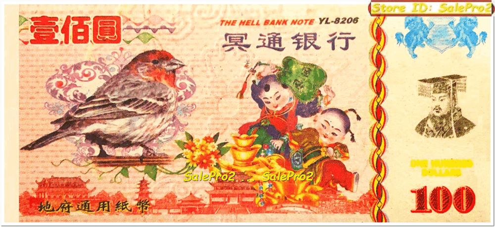 CHINA HELL BANK $100 DOLLAR JOSS PAPER CHINESE SPARROW BIRD HELL NOTE BANKNOTE UNC CHINA HELL BANK ** $100 DOLLAR JOSS PAPER ** CHINESE SPARROW BIRD HELL NOTE BANKNOTE HELL NOTE IS IN NEW & UNCIRCULATED CONDITION Hell Notes , in many Chinese religious traditions, used usually beneath the earth, of the unredeemed dead or the spirits of the damned, in the grave right beside the dead person's body, to have some cash money, to live well & spend in the next Life Shipping : 1.95 CANADA, 2.55 USA & 3.95 International (Worldwide) (depending on the country), Worldwide shipping in Safe & Secure packaging ~ Additional item shipping fee is 50¢ (Canada & USA) as well as (International) ~ We ship all orders within 24-48 hours as soon as your payment reaches us cleared All pictures are Watermarked with our User id or Store name to prevent image piracy Paypal is our online payment method, other methods are available during the checkout