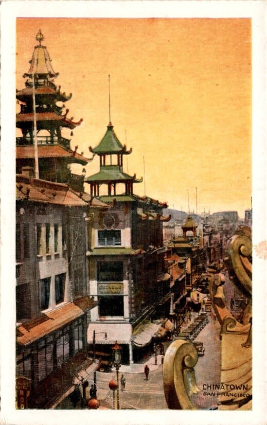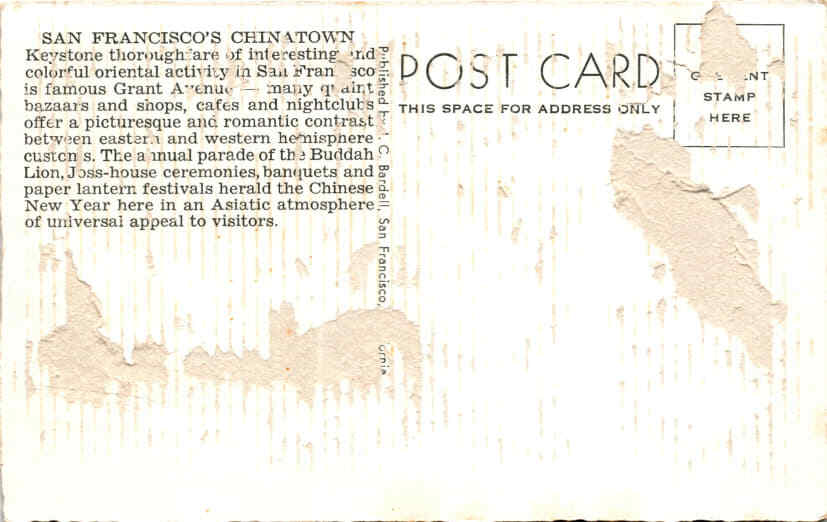 MAKE AN OFFER. THE MORE YOU BUY THE BETTER DEAL I WILL ACCEPT The postcard describes San Francisco's Chinatown as a vibrant and colorful neighborhood with a bustling atmosphere. Grant Avenue is highlighted as a key thoroughfare in Chinatown, known for its many shops, cafes, and nightclubs. The area offers a blend of Eastern and Western cultures, creating a picturesque and romantic setting.