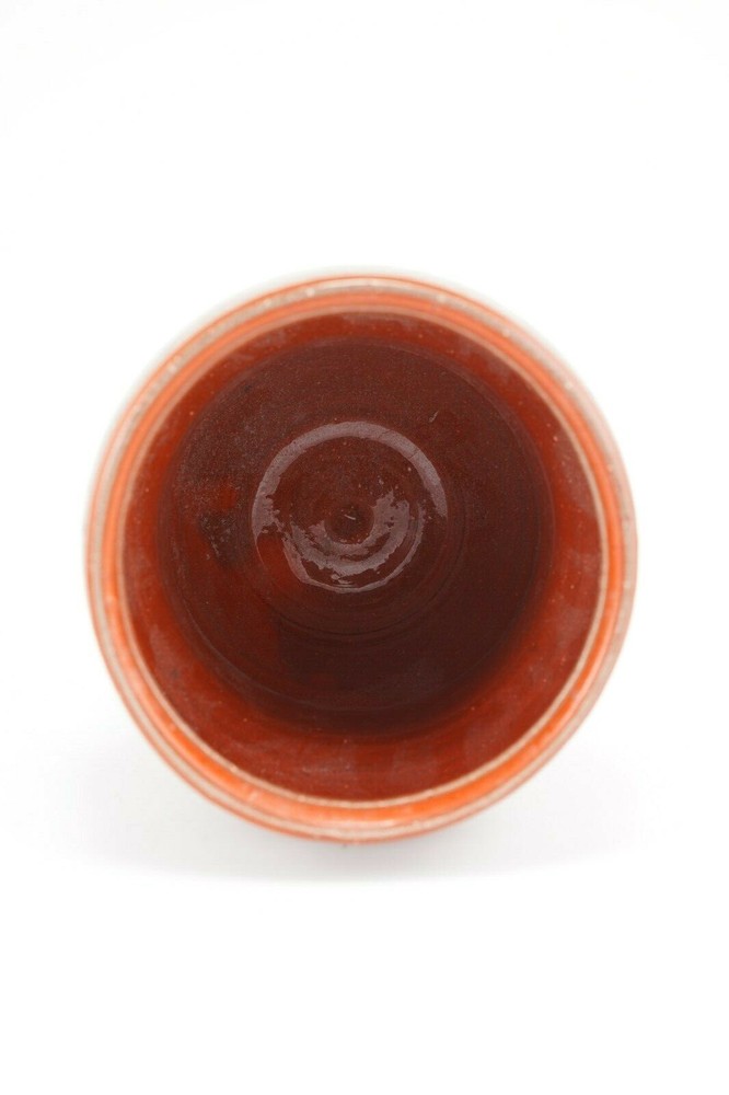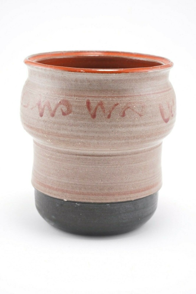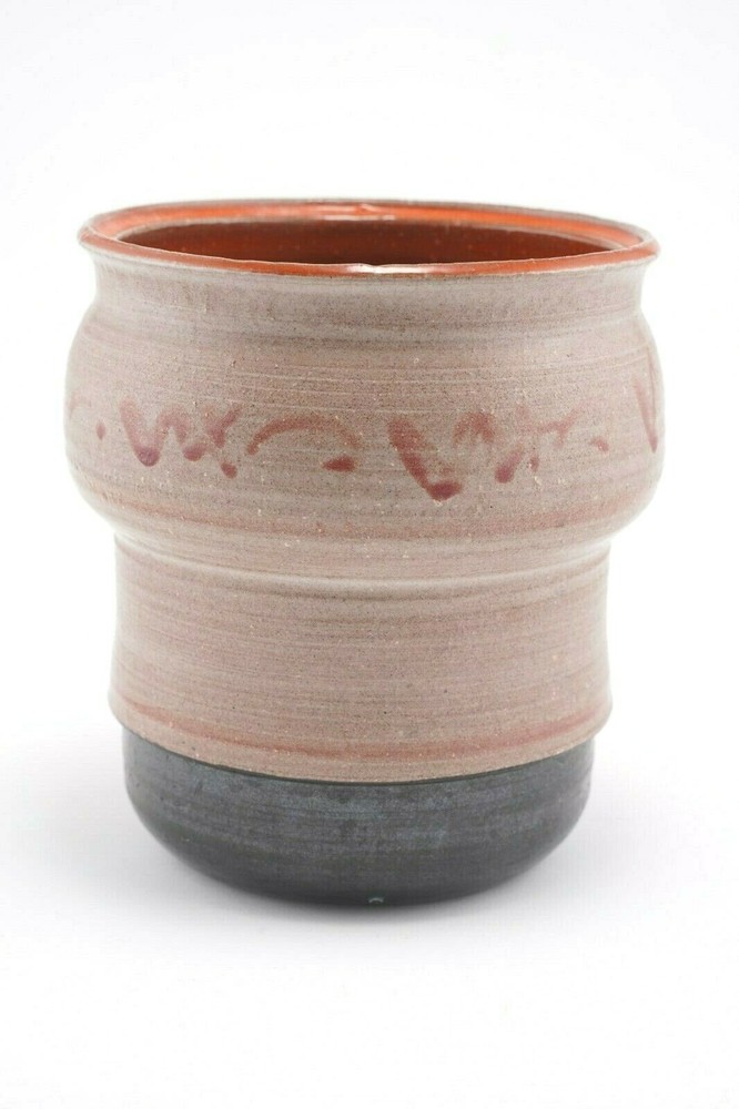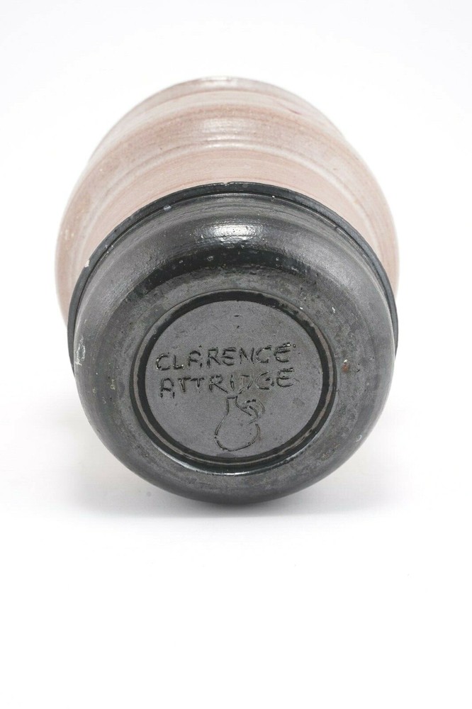CLARENCE ATTRIDGE Studio Pottery Vase California & NY Artist Mid Century, 5 1/2" tall x 5" in diameter. In good condition. 0.5mm (tiny) chip near the base (see photo). Priced accordingly. Brick-orange interior, with a taupe and orange exterior and unique “scribbling” on exterior. Artist signed bottom of pot. Clarence F. Attridge was born in New York, NY in 1907. Prior to moving to the San Diego, California area he lived in Rochester, New York, where this piece was purchased during this time. He received his initial art training from the Mechanics Institute (now the Rochester Institute of Technology). After art school Attridge worked for many years as a scenic artist painting scenes for theatres on Broadway. He also designed and painted murals for churches, theatres, and for the homes of people of influence. For years Attridge was an art teacher, teaching fundamentals of landscape, seascape and abstract painting. He exhibited widely in San Diego and Southern California, winning many awards in the venues in which he exhibited his works. He passed away in Oceanside, CA in 1992.