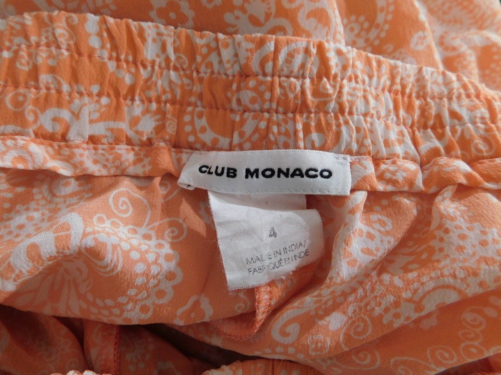 CLUB MONACO Women's Orange & White Paisley Print Elastic Waist Silk Short Sz 4 CLUB MONACO Women's Orange & White Paisley Print Elastic Waist Silk Short Sz 4 Details CLUB MONACO Women's Orange & White Paisley Print Elastic Waist Silk Short Sz 4 Brand: Club Monaco Material: 100% silk Size: 4 Pleats: no Lined: unlined Care Instructions: dry clean Measurements: Waist: 14" - 18" Hips: 19.5" Rise: 10" Inseam: 3.3" Cuff: na Leg Width at Hem: 12.5" FREE SHIPPING IN THE USA ss3078 Payment We accept all forms of payment from PayPal which includes American Express, eCheck, Bank Transfer, MasterCard and Visa. Please make payment promptly after winning our Auction or Fixed Price listing. Thank you. Shipping We ship 5 days a week, Monday thru Friday. Return Policies We allow up to 14 days for returns. Item must be in the original condition that we shipped to you.