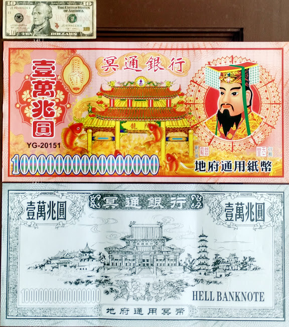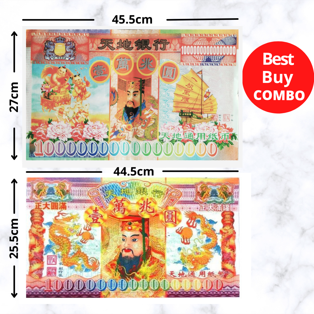 FREE SHIPPING TO USA (EXCEPT RURAL AREA)! πJoss paper money notes Chinese heaven hell money notes π 1 sets 60 sheets SUPER GIANT HELL NOTE (Each design 30 sheets) π 10 Quadrillion Ancestor Hell Note π Paper Size: 17.2 inch x 10.6 inch and 17.2 inch x 9.8 inch respectively . this is really huge! π T hey are also commonly burned as offerings for ancestors and requests for blessings of prosperity and good fortune. π§‘The notes are used to burn for the 'Hell Gods,' offering them monetary distraction so they will leave mortals at peace. π Suitable use on Funerals, Ancestor Birthdays and Death Anniversaries, Qingming Festival, Hungry Ghost Festival, Daily Life Product Description β Ancestor Money or Joss Paper offering is a beneficial practice for yourself and the ancestors. β When our loved ones transition, they still need things in the afterlife. One of these things is ancestor money to help dissolve debt in this realm and beyond! β Burning Ancestor Money on your altar is a very easy practice that yields phenomenal benefits. You can burn one or more bills everyday, on set days, or whenever you can. β These hell notes feature an image of the Jade Emperor, the presiding monarch of heaven in Taoism. β The notes are used to burn for the βHell Gods,β offering them monetary distraction so they will leave mortals at peace. β They are also commonly burned in Asia as offerings for ancestors and requests for blessings of prosperity and good fortune.