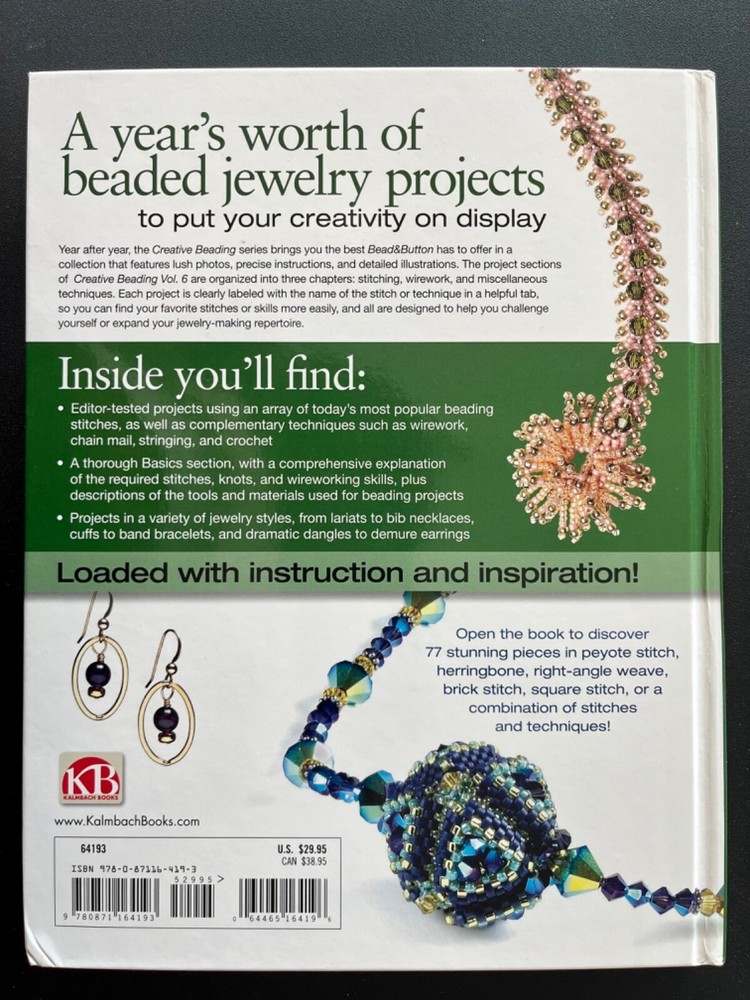 "Creative Beading: The Best Projects from a Year of Bead & Button Magazine". Pictorial Hardcover book, Sixth Volume in the series Published in 2011 by Kalmbach Publishing 255 pages of text instructions with full color photos. Measures 8-1/2" x 11", weighs 2 lb. 5 oz. Original book price is $29.95 Condition: Excellent condition! I also have other Creative Beading books available for sale (#1-13). I will be happy to combine shipping for multiple book purchases!