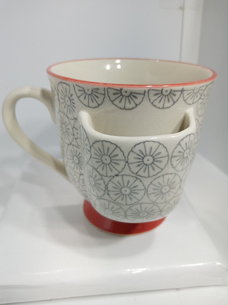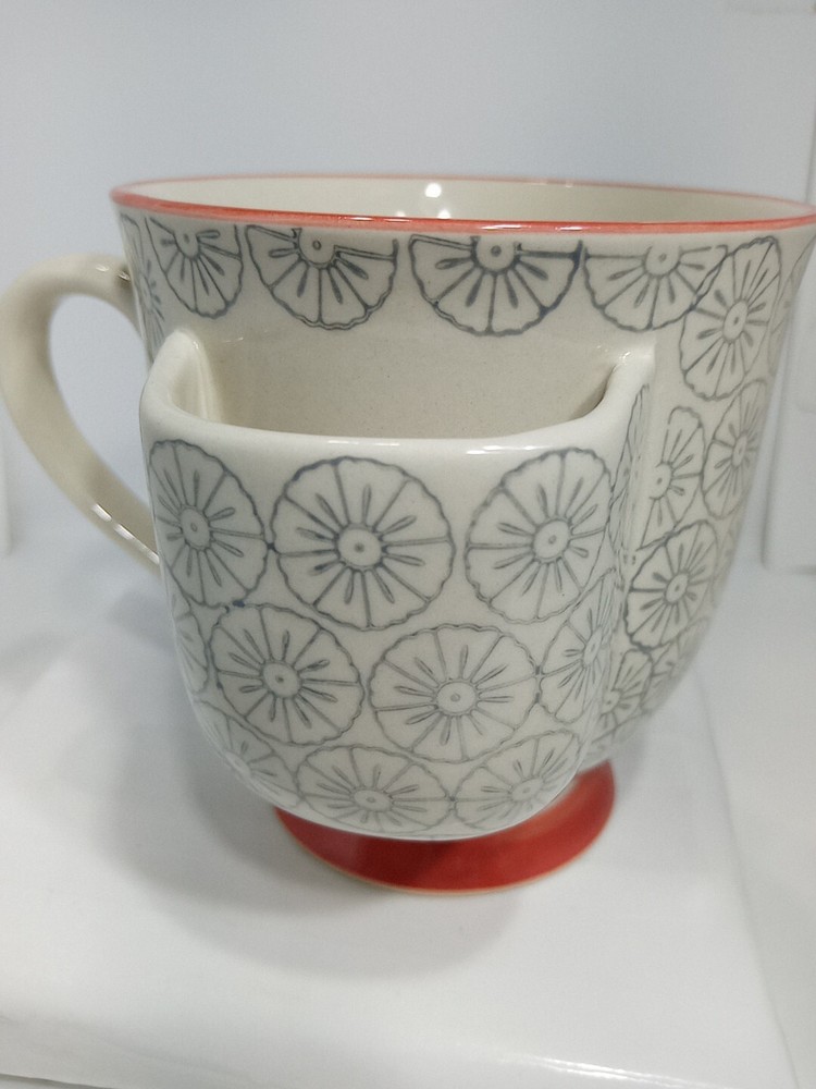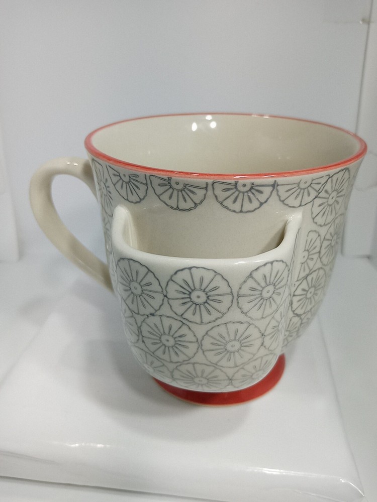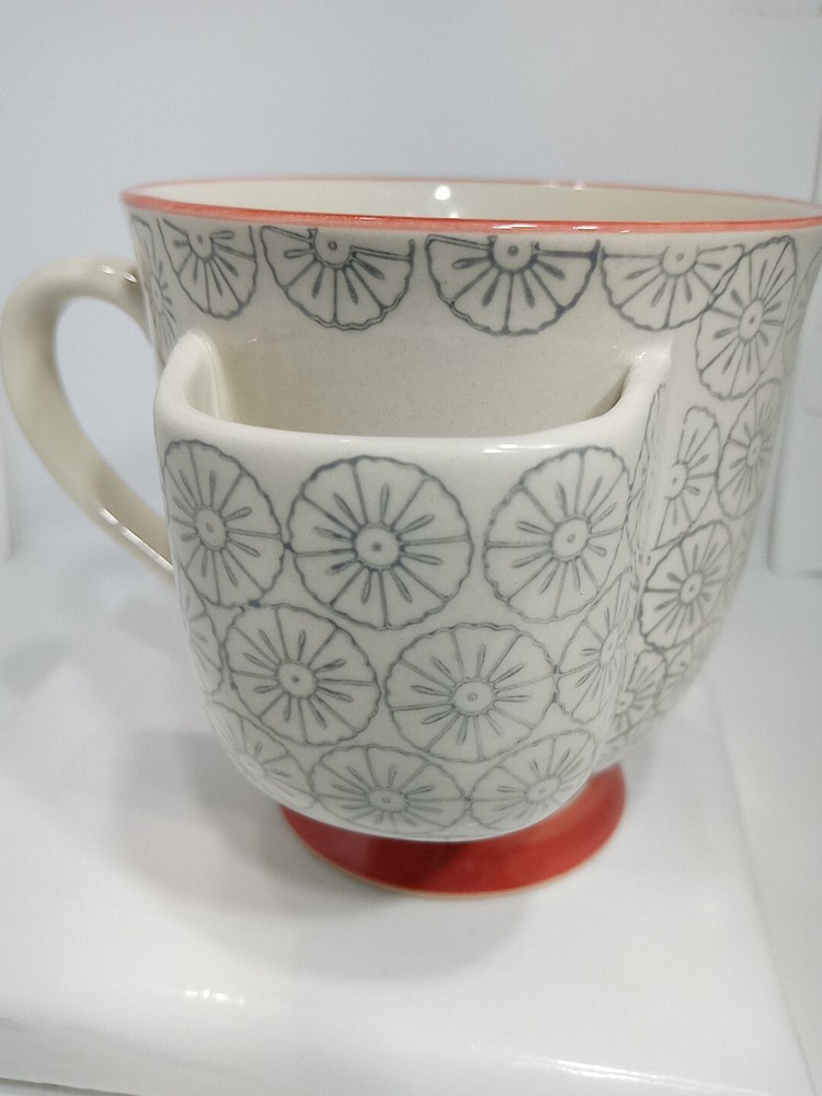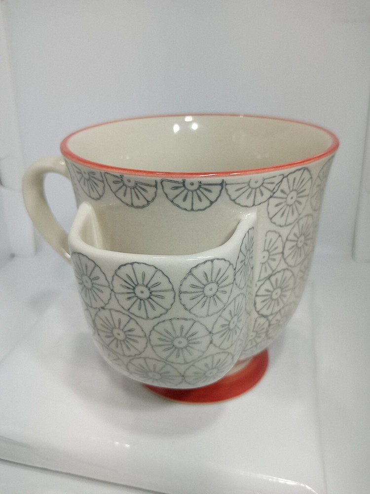 CREATIVE CO-OP COFFEE MUG. TEA BAG HOLDER MUG. DECORATIVE FOOTED MUG. B337 Shipped with USPS priority mail. This beautiful ceramic coffee mug is perfect for all occasions. With a round shape and a unique novelty pattern, it is sure to stand out in any collection. The mug has a capacity of 12 fl oz and is microwave safe for easy use. It features a handle with care and is machine washable for easy cleaning. The art deco style and multicolor design make it a great addition to any home or office. This mug is perfect for coffee, tea, latte, or any other beverage of your choice. Add it to your collection.