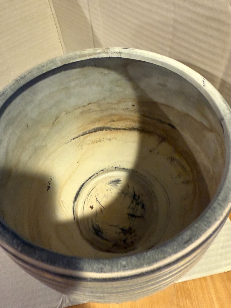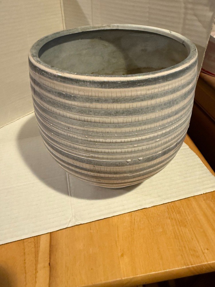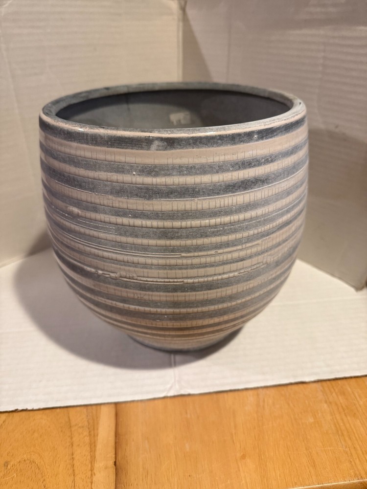 CREATIVE CO-OP Embossed Stoneware Planter with Reactive Glaze Finish 8 1/4H GRAY AND WHITE STRIPES ORIG. $68.00 HAS DISCOLORATION INSIDE SOME CRAZING AT BOTTOM