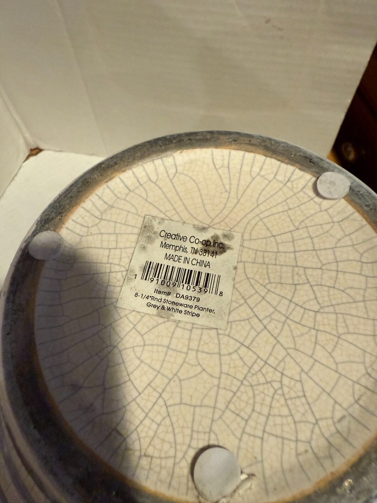 CREATIVE CO-OP Embossed Stoneware Planter with Reactive Glaze Finish 8 1/4H GRAY AND WHITE STRIPES ORIG. $68.00 HAS DISCOLORATION INSIDE SOME CRAZING AT BOTTOM...