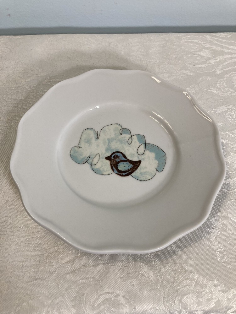 CREATIVE CO-OP Lou Siebert Small Blue Bird Plate; no damage; dia 5 1/2". Condition is Used. Shipped with USPS Ground Advantage.