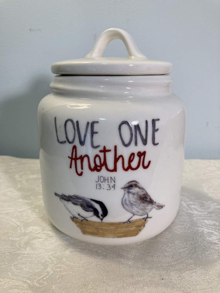 CREATIVE CO-OP "Love One Another" Canister; no damage; ht app 6" with lid. Condition is Used. Shipped with USPS Priority Mail....