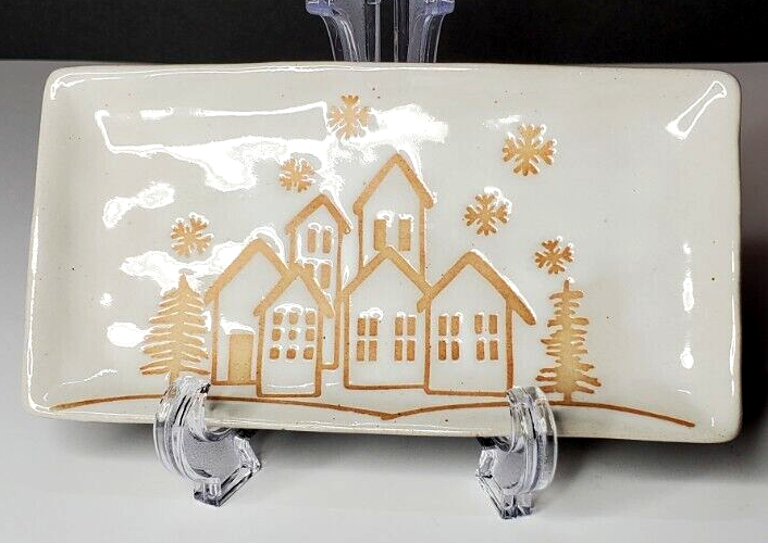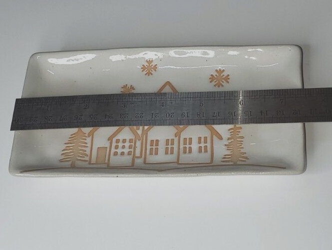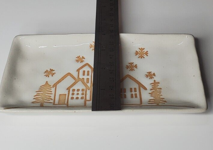 Christmas time will be here before you know it. Soon it will be time to decorate for the holidays. This platter will make a great addition to your kitchen and holiday decor. It can be used to serve refreshments to your guest and as well as a lovely piece of decor to spruce up your home. The reactive glaze relief image of a winter town will please anyone, regardless of what they celebrate during the holiday season. The platter is made of stoneware and measures 7.25" x 4".