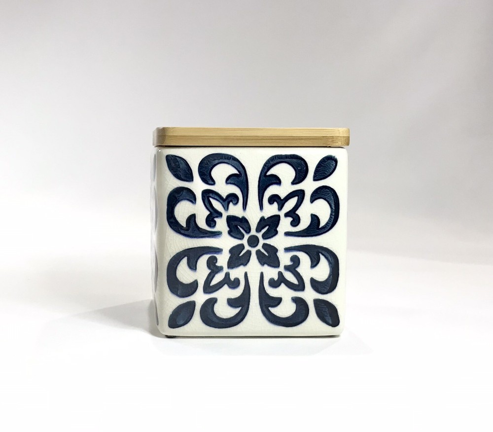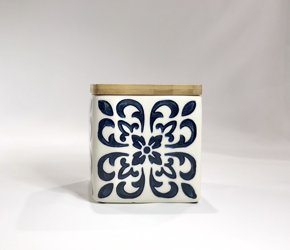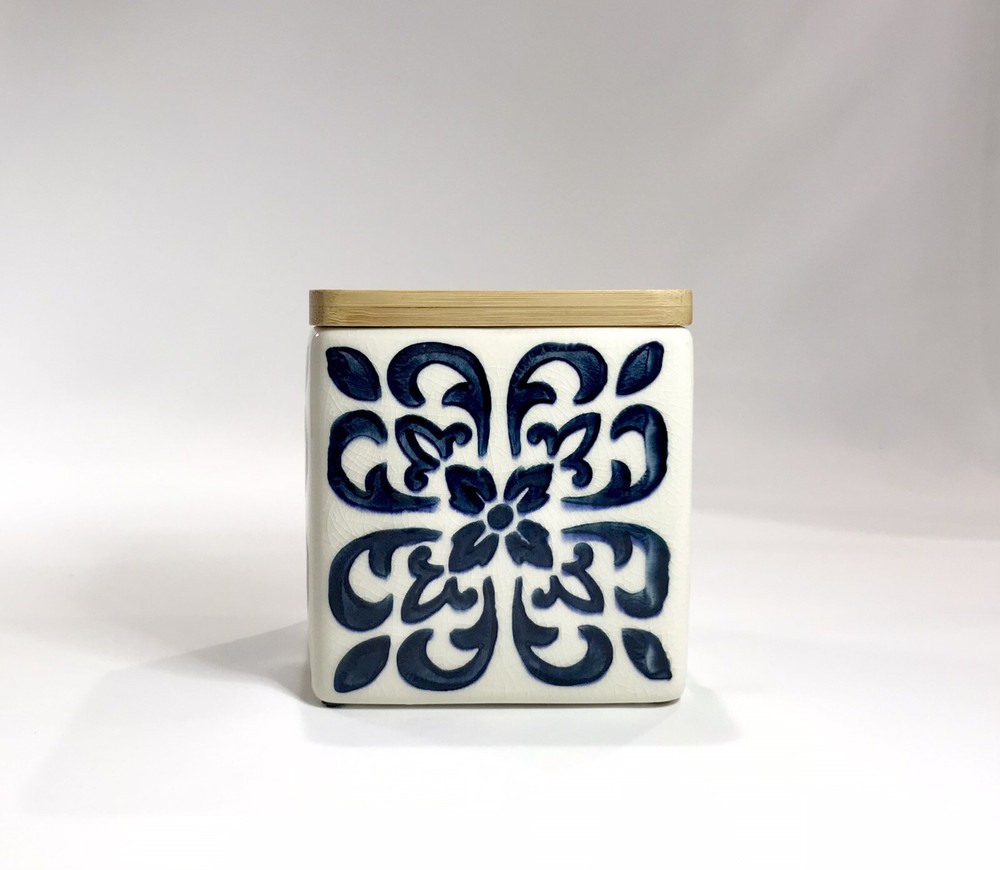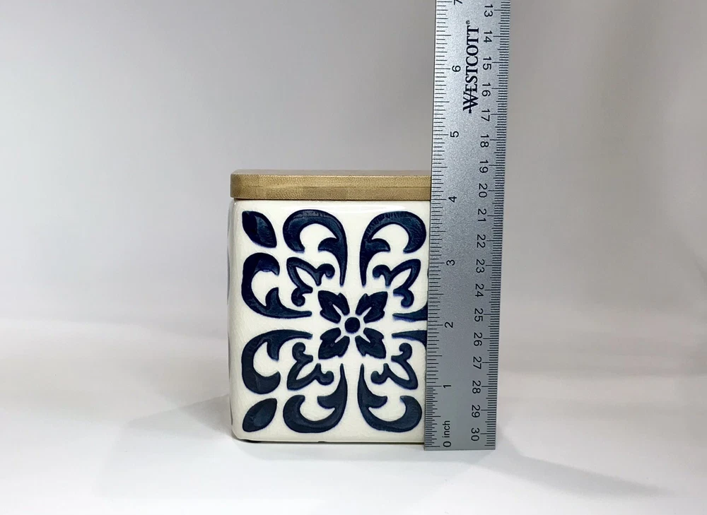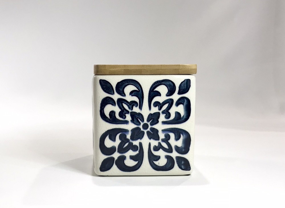 Never used. Process imperfection interior - image 6. Process imperfections on bottom exterior - image 7. Removable silicone for easy cleaning. Lovely hand stamped pattern. Bright shiny canister. Opening - 3 3/4" sq. CREATIVE CO-OP Stoneware Container Canister Blue Floral Geometric Design Bamboo.