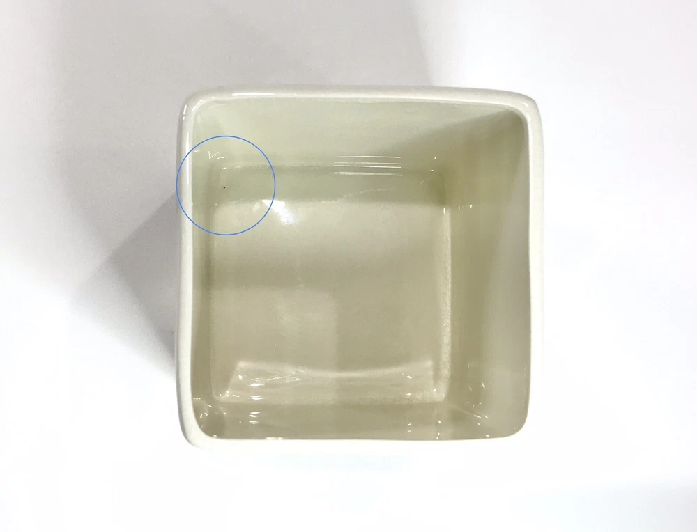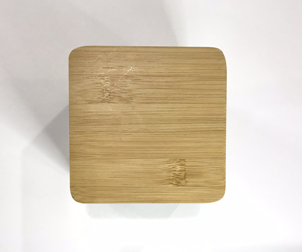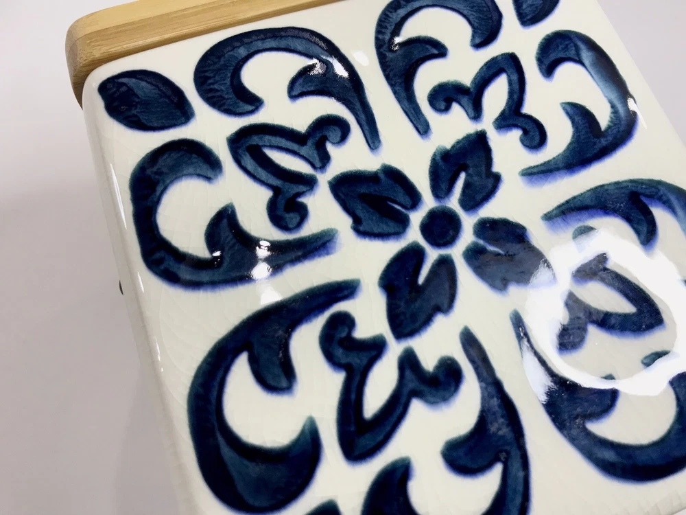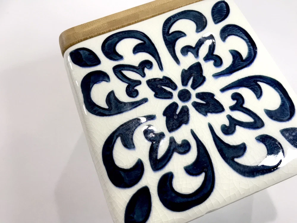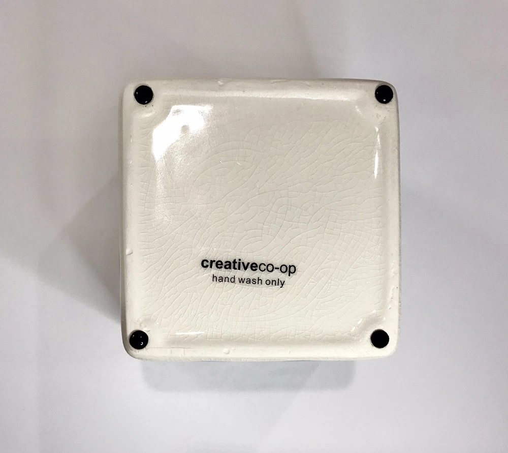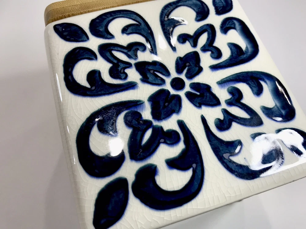Never used. Process imperfection interior - image 6. Process imperfections on bottom exterior - image 7. Removable silicone for easy cleaning. Lovely hand stamped pattern. Bright shiny canister. Opening - 3 3/4" sq. CREATIVE CO-OP Stoneware Container Canister Blue Floral Geometric Design Bamboo.
