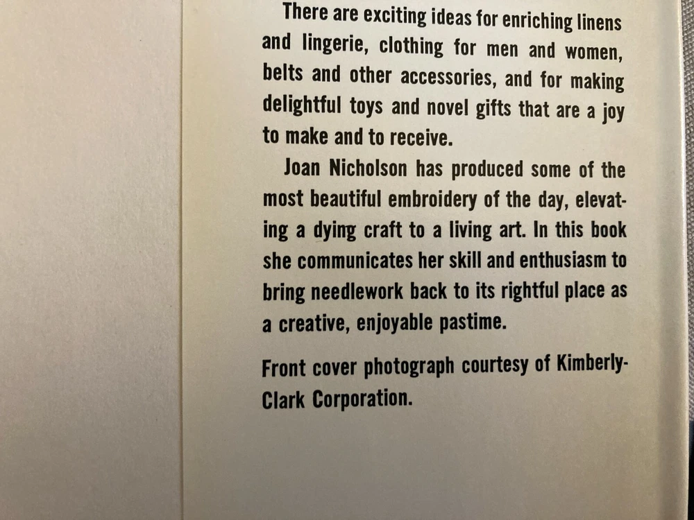 CREATIVE EMBROIDERY BY JOAN NICKOLSON. GRAMERCY PUBLISHING COMPANY, NEW YORK 1960. BOOK IS IN VERY GOOD CONDITION: DUST COVER IS GOOD. 128 PAGES, BOOK IS 8 1/2" BY 5 3/4". EMAIL ANY QUESTIONS, (6-C)...