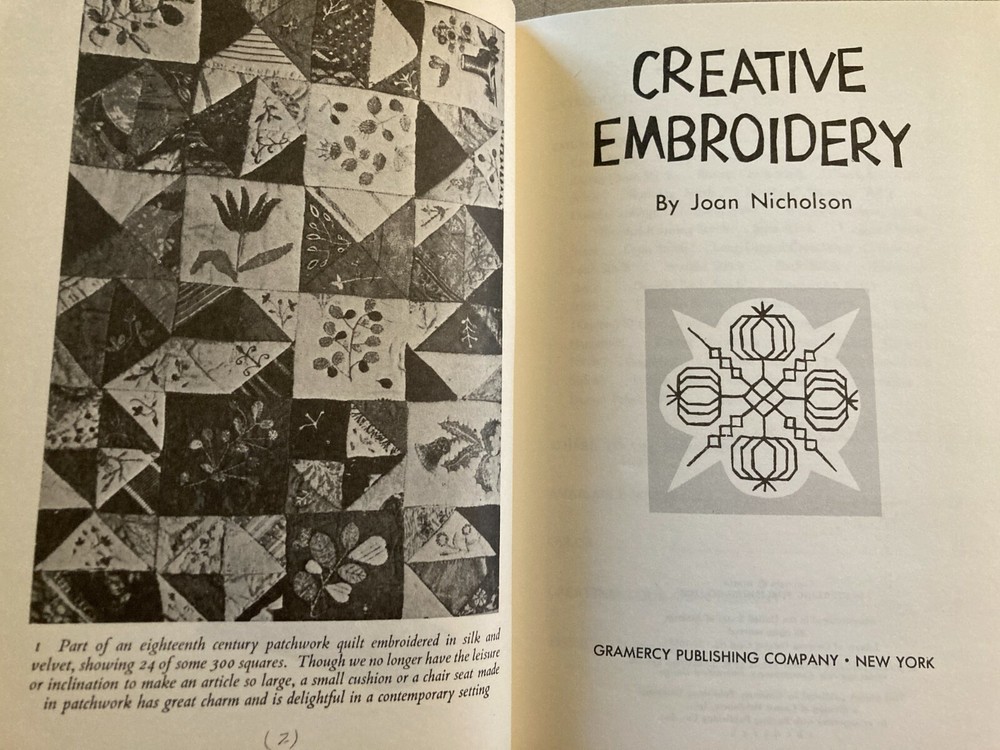 CREATIVE EMBROIDERY BY JOAN NICKOLSON. GRAMERCY PUBLISHING COMPANY, NEW YORK 1960. BOOK IS IN VERY GOOD CONDITION: DUST COVER IS GOOD. 128 PAGES, BOOK IS 8 1/2" BY 5 3/4". EMAIL ANY QUESTIONS, (6-C)