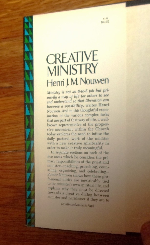 Hi! You're looking at a SUPERB and UNREAD condition book which is a classic guide to Creative Ministry written by HENRI J. M. NOUWEN--the book is an unstated First Edition and a HARDCOVER with the ORIGINAL DUSTJACKET and is NOT a remainder copy and NOT price-clipped, with the original $4.95 price in the upper corner of the front inner flap. This book is in SUPERB and UNREAD condition and the book itself hss a tiny owner's signature on the upper right corner of the blank first page and slight browning on the binding edges of the boards and first / last pages but NO other significant imperfections; the dustjacket has slight dings on the opening tips, a few very light scuffs and just very light shelfwear otherwise but NO other significant flaws! The book is titled Creative Ministry: Beyond Professionalism in Teaching, Preaching, Counseling, Organizing, and Celebrating and it was written by HENRI J. M. NOUWEN; it was published by Doubleday & Company, Inc. in 1971 and is an unstated 1st Edition copy. According to Henri Nouwen, the bestselling spiritual writer, every Christian is a minister—trying to live his life in the light of the Gospel. Creative Ministry is a thoughtful examination of the various complex tasks that are part of that way of life.Separate chapters treat each of the five areas that Nouwen considers the primary responsibilities of the minister: teaching, preaching, counseling, organizing, and celebrating. He shows how these main functions are inextricably tied to the minister’s spiritual life and why they must be directed toward a creative dialogue with other Christians if they are to be rewarding. It is also essential, he maintains, that the minister leave himself open, take risks, and “lay down his life for his friends” in order to give new life.“There is today a great hunger for a new spirituality,” observes Nouwen, a hunger that requires new and creative forms of ministry. Citing numerous examples from his rich experience, the author offers practical advice for infusing daily pastoral work with meaning. The result is an insightful presentation and a resonant spiritual guide for every man and woman who wants to be of service. A fantastic find, and a beaut iful copy of this book! Thanks for looking, and good luck if you're bidding! Also be sure to check out all of my other great books currently listed on ebay auctions--I can combine shipping for multiple purchase s !