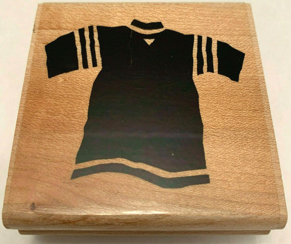 CLOSE TO MY HEART (CTMH) COMPANY brand rubber stamp featuring an ice hockey jersey/shirt. This stamp is great for scrapbooking, crafts, or making greeting cards. The wood mount measures 2.5 inches x 2.5 inches. The rubber stamp surface measures approximately 1.75 inches x 2 inches .