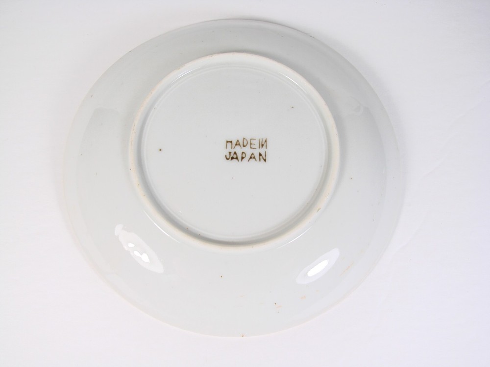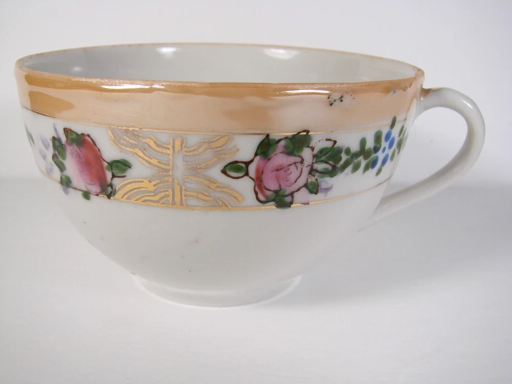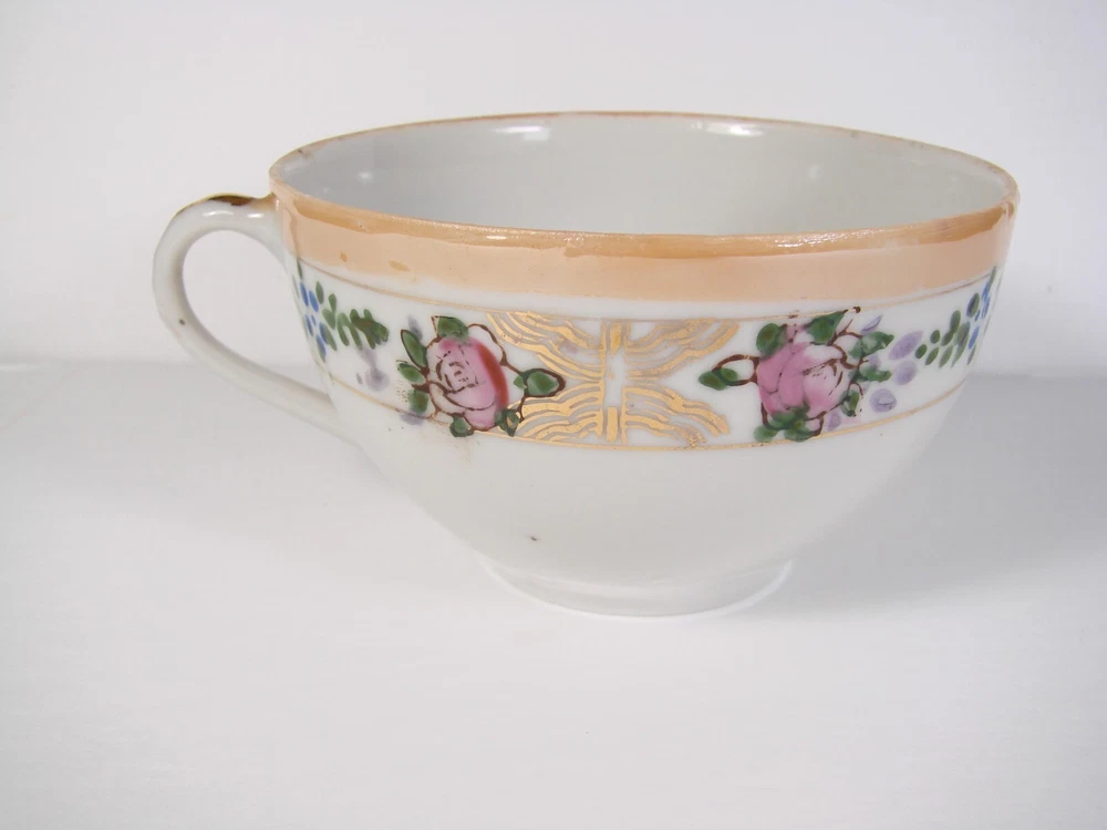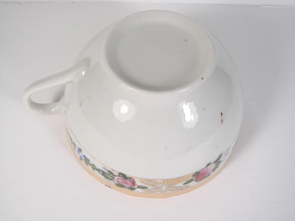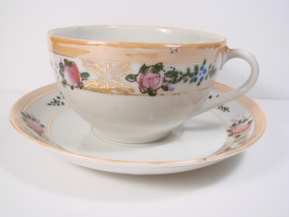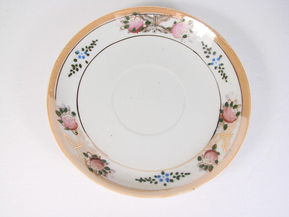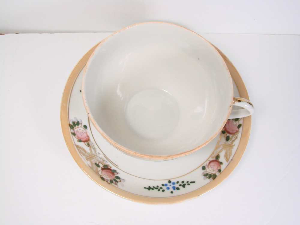 This is a very nice set of a cup and saucer, made in japan. It has a good floral design which matches the cup to the saucer with both having a soft orange rim setting to the cup and saucer. The pink roses pattern on the cup and saucer brings them together in a compfortable fashion. And the porcelain crafting is traditional to the great 'Made in Japan' quality.