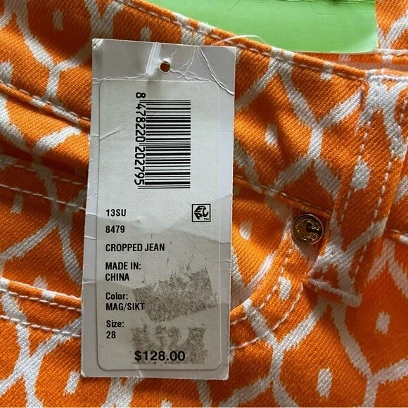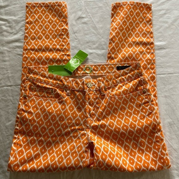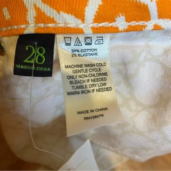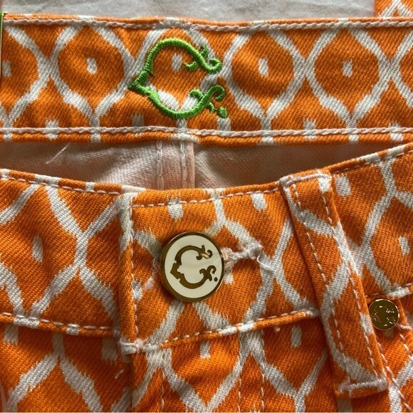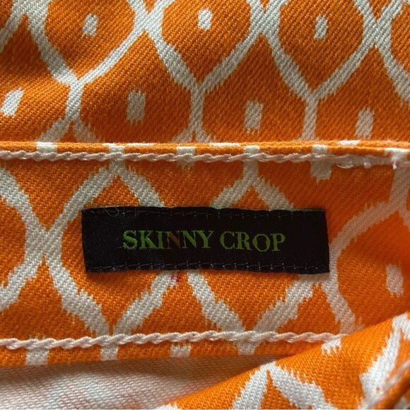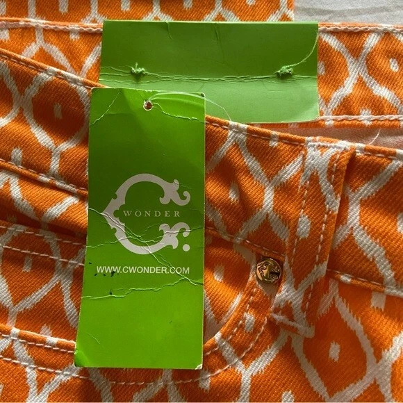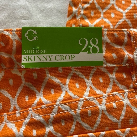 The C.WONDER Orange Geometric Pattern Women’s Size 28 Mid-Rise Skinny Crop Pants are stylish and versatile pants perfect for various occasions such as travel, parties, casual wear, work, and business. Made of denim fabric with a mid-rise fit and a 27-inch inseam, these cropped pants feature a zip and button closure, along with pockets for added convenience. The vibrant orange geometric pattern adds a pop of color to your wardrobe, while the slim fit and skinny leg style give a modern and flattering look. Easy to care for with machine washable instructions, these pants from C. Wonder are a must-have for any fashion-forward woman.