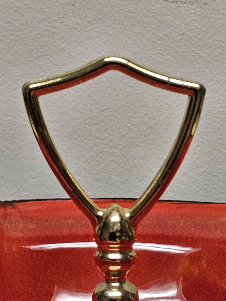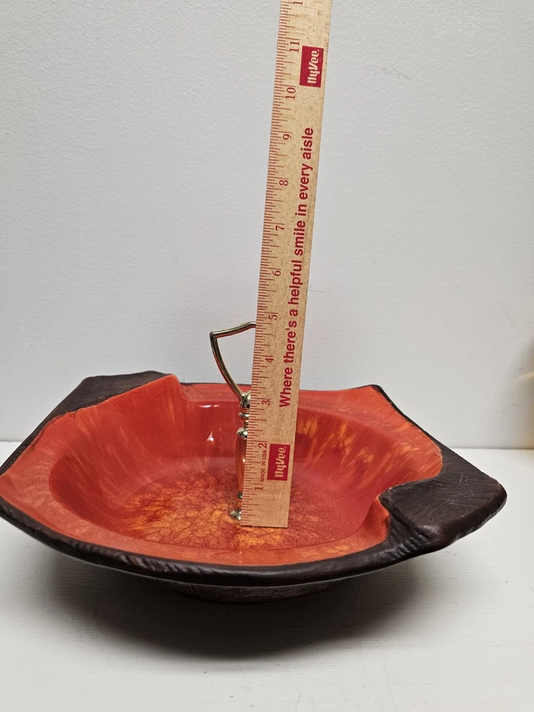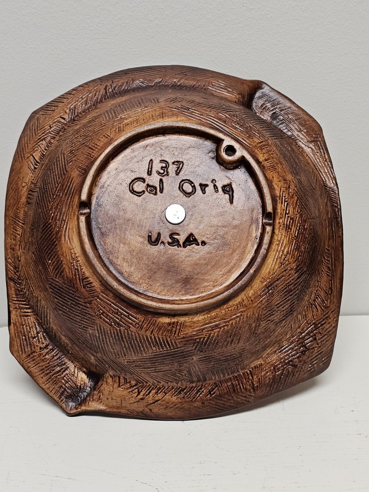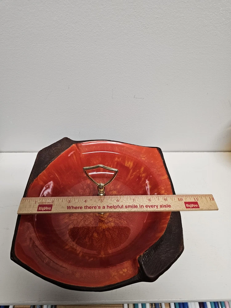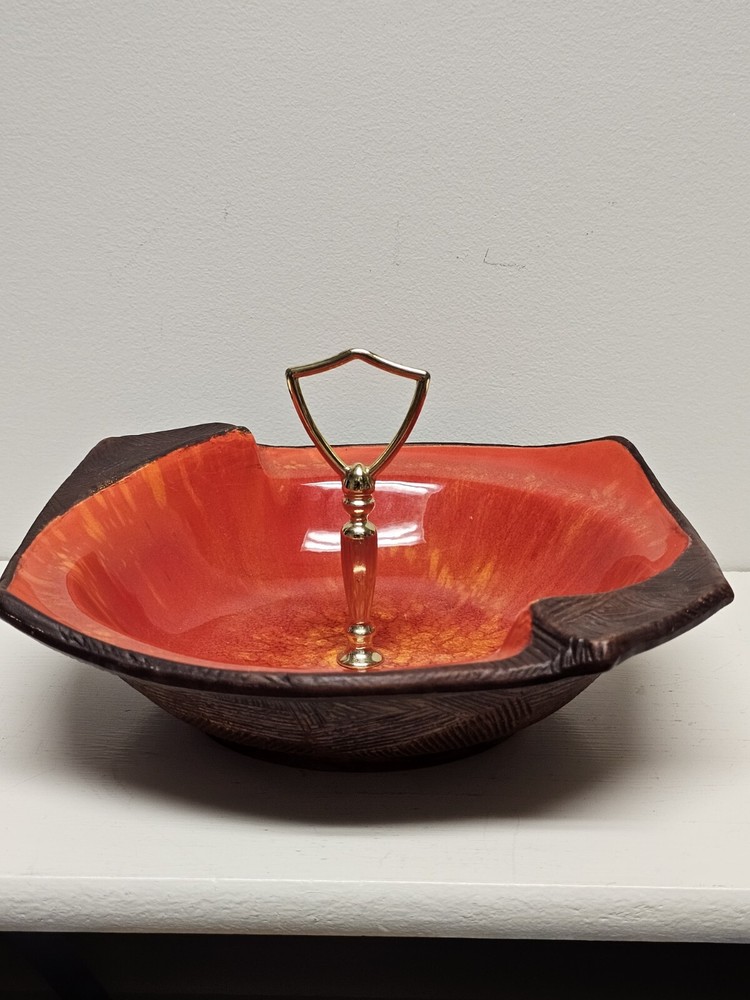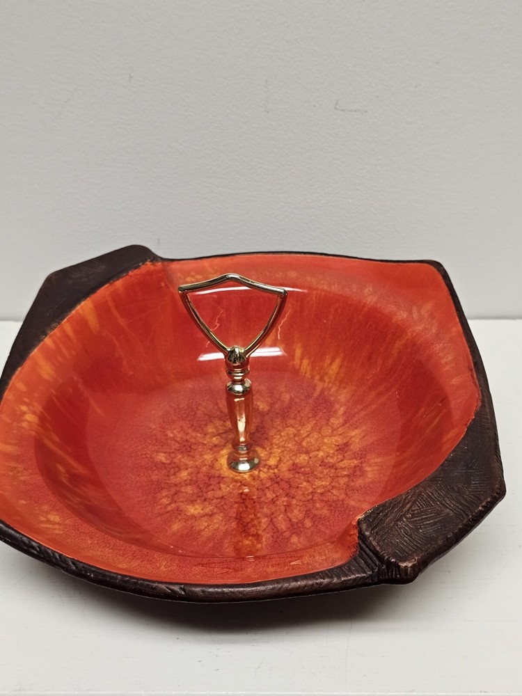 This California Originals candy dish from the mid-century era is a beautiful addition to any collection. Made in the USA by California Pottery, it features a vibrant red and brown color scheme with a unique MCM candy dish theme. The dish is made of ceramic and has a handled design, making it perfect for serving candy or other small treats. The candy dish has an item number of 137 and is an original vintage piece. It was produced using a pottery technique and has a product line called Century. The dish is in excellent condition and is perfect for adults who want to add some mid-century charm to their home decor. Please look at pictures closely as there are very small areas where glaze has been nicked from use and age. Also handle has imperfections due to age. If you have questions please reach out as this is a beautiful piece.