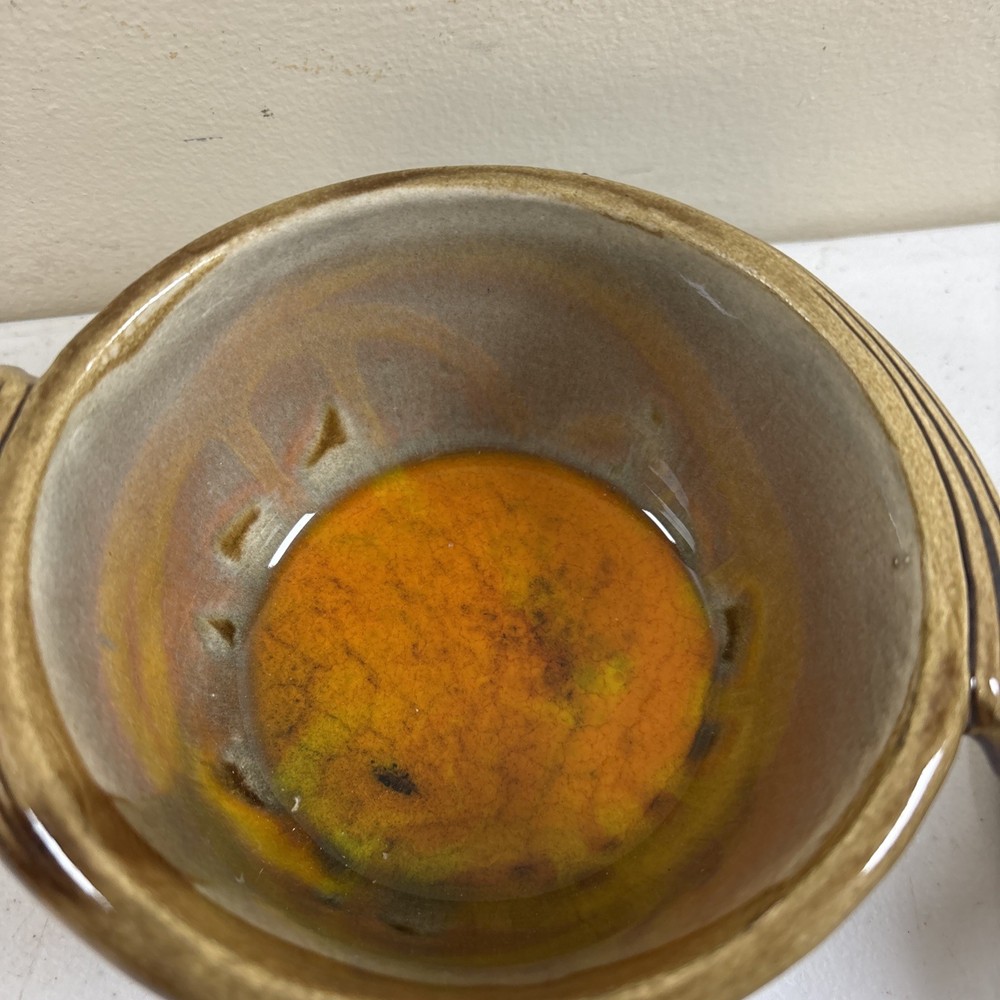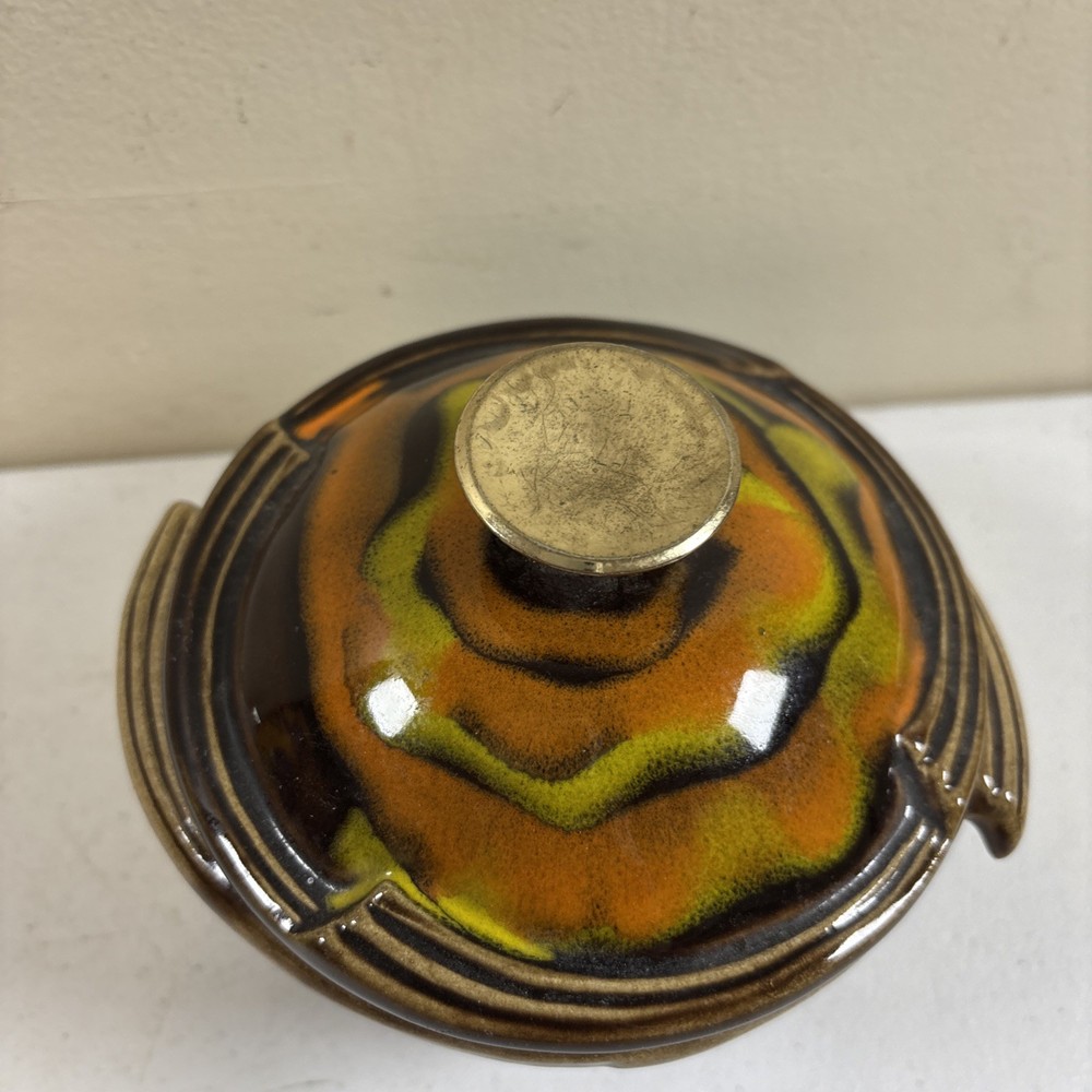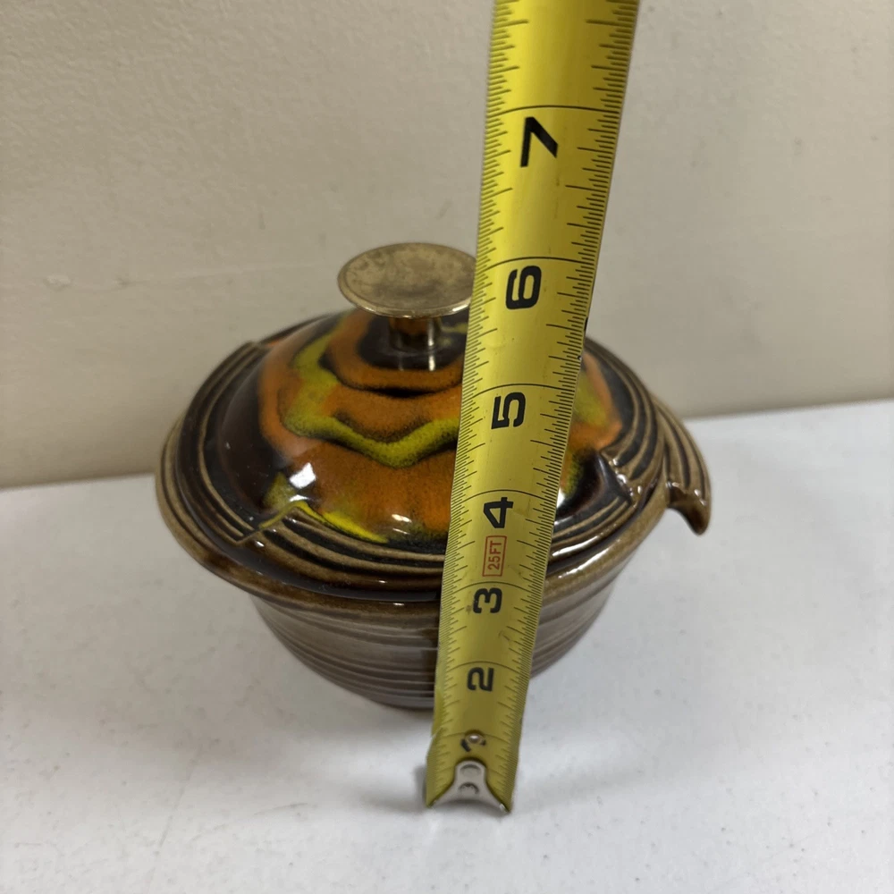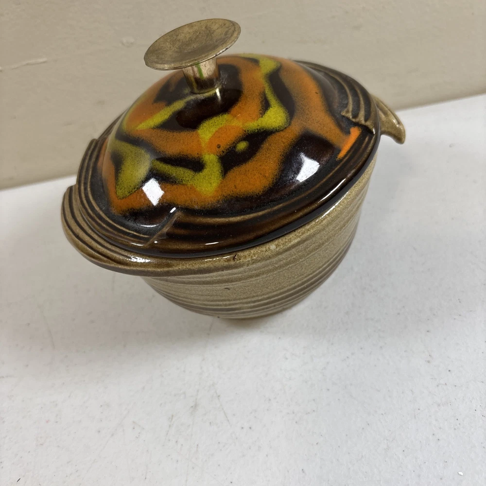 Add a touch of vintage charm to your home decor with this stunning California Pottery lidded bowl. The orange and brown drip design is a perfect representation of the Mid-Century Modern style that is making a big come back in today's design trends. The bowl measures 5 inches in height and is made of high-quality pottery material that is both durable and easy to clean. This California Pottery bowl is a great addition to any collection and is sure to impress your guests. The bowl is a vintage original and was made in the United States using traditional pottery techniques. It has a round shape and is perfect for serving soups, stews, and other dishes. Don't miss your chance to own this unique piece of history. In good condition. No chips or cracks