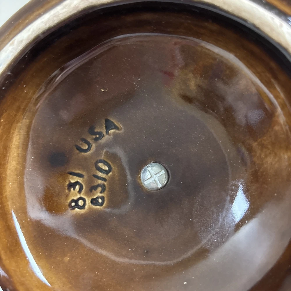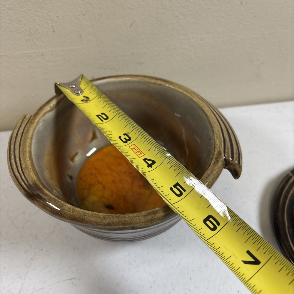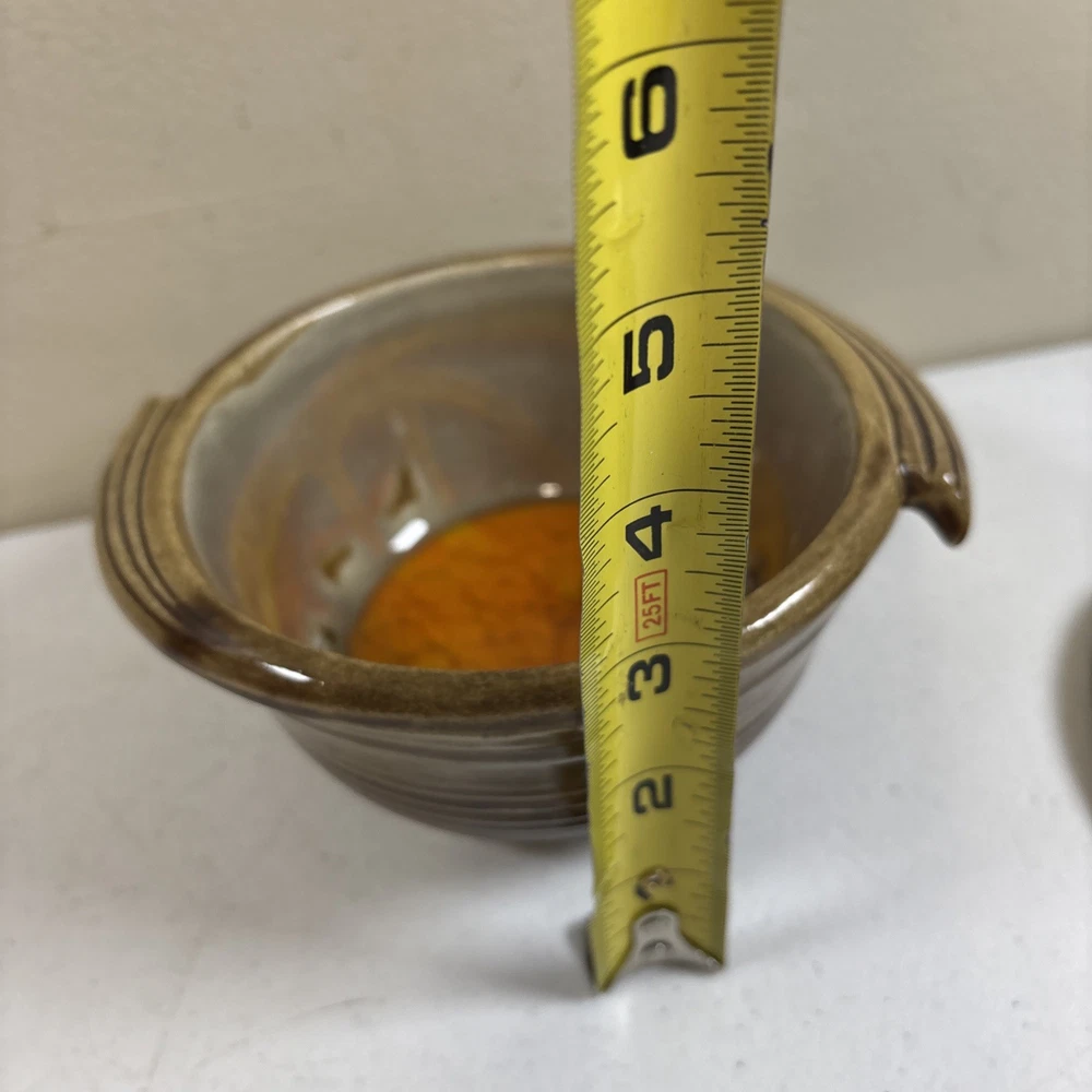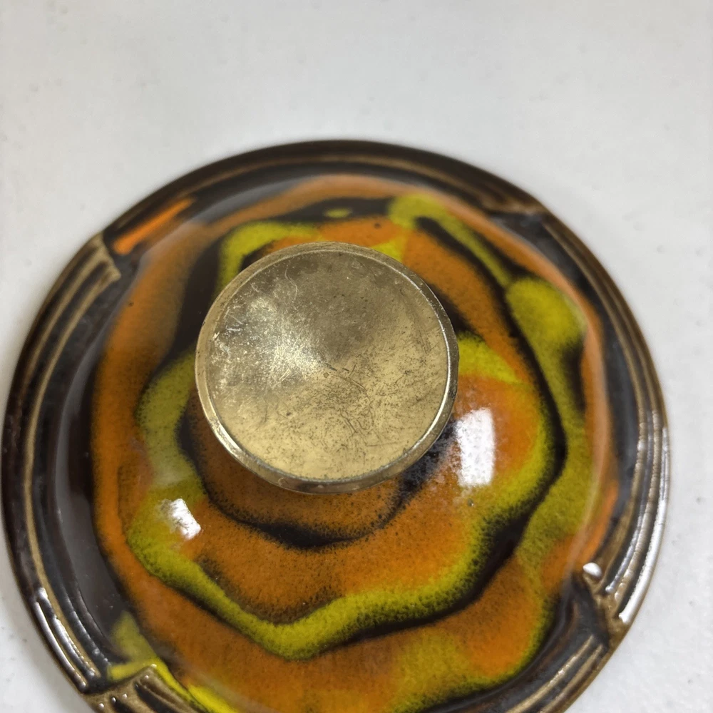 Add a touch of vintage charm to your home decor with this stunning California Pottery lidded bowl. The orange and brown drip design is a perfect representation of the Mid-Century Modern style that is making a big come back in today's design trends. The bowl measures 5 inches in height and is made of high-quality pottery material that is both durable and easy to clean. This California Pottery bowl is a great addition to any collection and is sure to impress your guests. The bowl is a vintage original and was made in the United States using traditional pottery techniques. It has a round shape and is perfect for serving soups, stews, and other dishes. Don't miss your chance to own this unique piece of history. In good condition. No chips or cracks